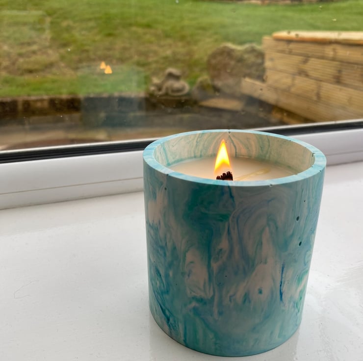 What more could you want than a candle which not only smells incredible, but is also resuable once the candle is done! Wether you fancy using it as a makeup brush pot, somewhere to store pens and pencils, or just a cute piece of décor to put those plants you keep buying! Each candle is handmade individually and can come in a variety of colours to match your home. Made using Soy Wax and carefully selected scents, this candle will give your home the refresh you've been looking for and need! If you are wanting any custom colour combinations which aren't available on the website, please get in touch via instagram! The candle pots are created using a concrete-resin material called jesmonite, I add pigments and stir the mixture to create the marble effects or add small pieces of jesmonite to create the chip effect. Once they are set, they are sanded off and waxed using an organic wax (coconut and soy way). This helps to protect each product from and sun damage, water stains, dirt etc. All that I ask is that you give it a wipe if there are any spillages nearby to ensure this wax isn't removed.