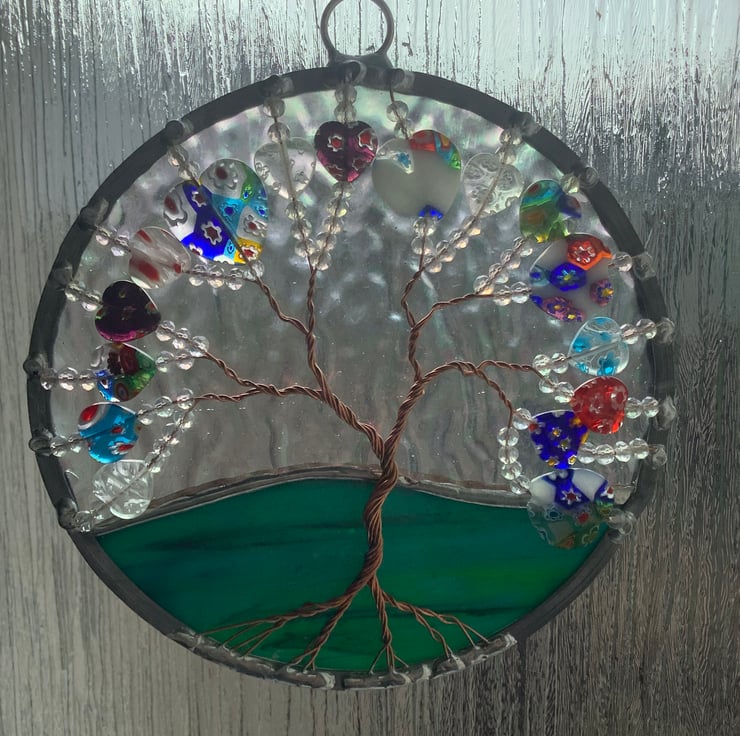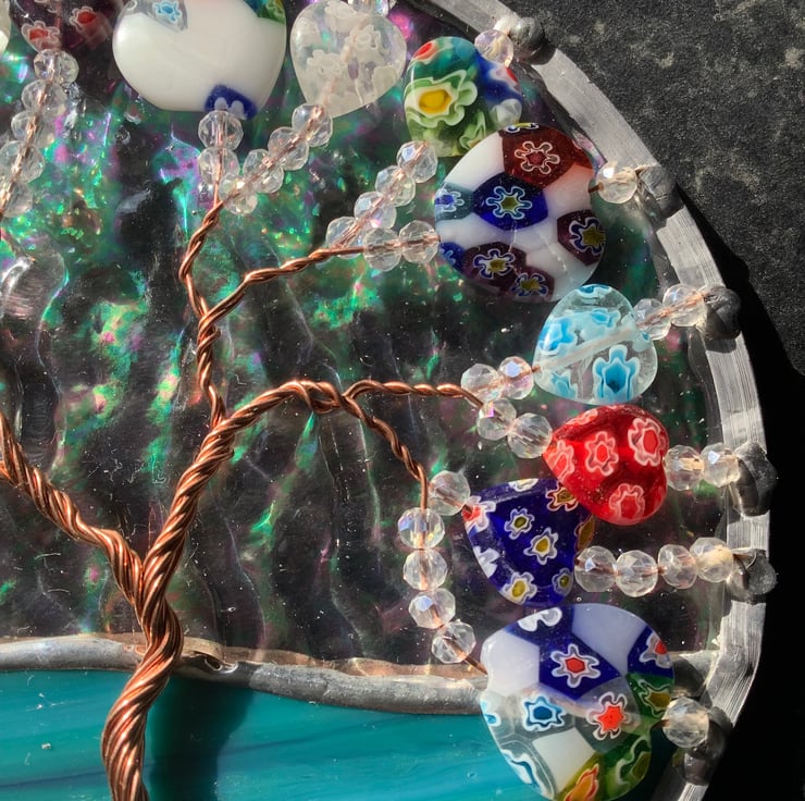 A millefiori heart tree of life decoration that works as a suncatcher or wall hanging.