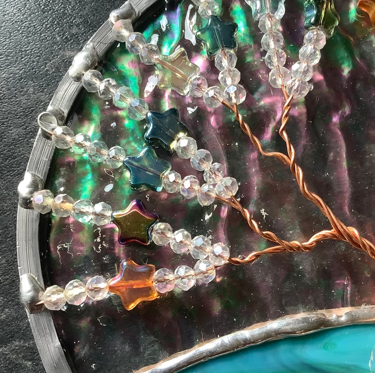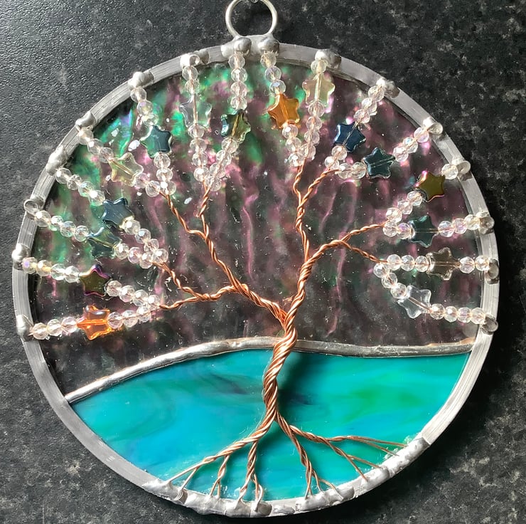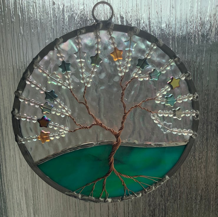 The background has an irridised textured clear glass with a green/blue mix base that have been foiled and soldered together . There is a twisted copper wire tree with branches filled with electroplated glass stars and the panel is edged with a traditional lead came channel.