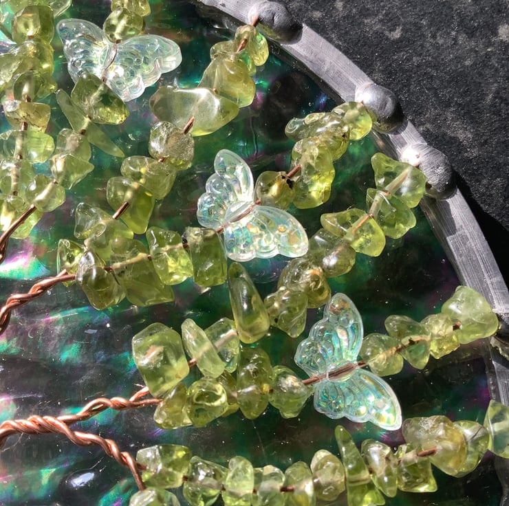 The background has an irridised textured clear glass with a green/blue mix base that have been foiled and soldered together . There is a twisted copper wire tree with branches filled with peridot gemchips with sparkly butterflies and the panel is edged with a traditional lead came channel.