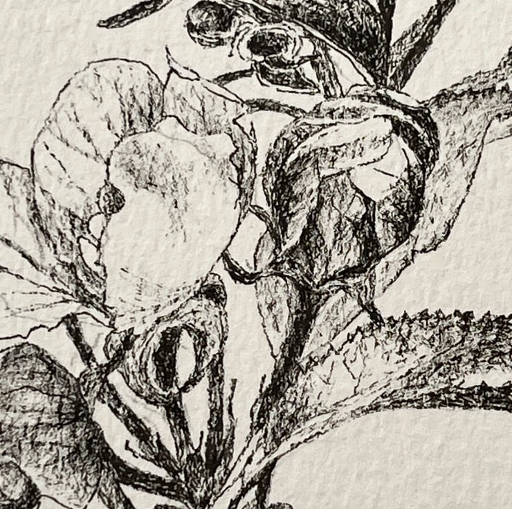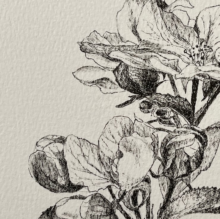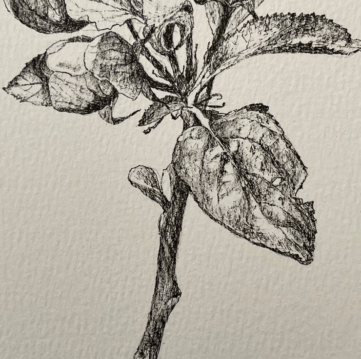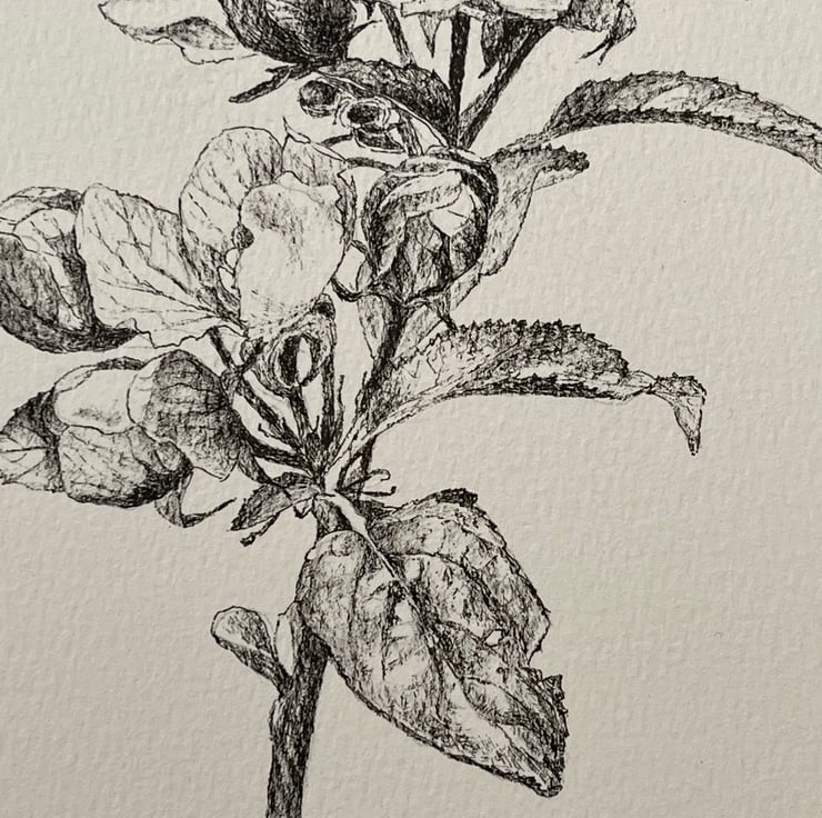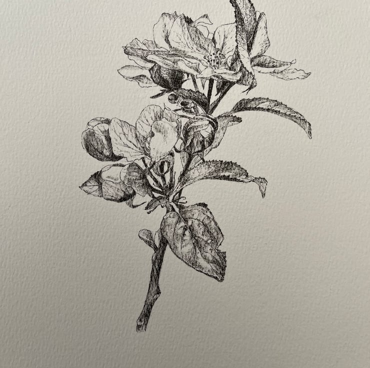 An ink drawing on acid free 300gsm artists watercolour paper. The paper measures 21cm by 29.5cm and the image measures 17cm by 11.5cm. The drawing was made with black ink and features an image of apple blossom. An original drawing, not a print that would make an ideal gift for someone. The drawing will be sent inside a board back envelope.