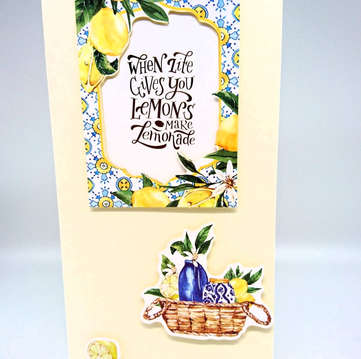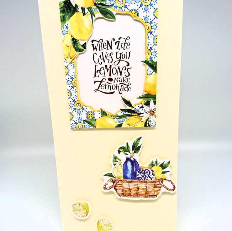 DESCRIPTION: Encouragement card with motivational message. " When Life Gives You Lemons Make Lemonade". A support card to inspire the recipient to turn a difficult or sour situation into a sweet and refreshing outcome using creativity and a positive attitude. A design to uplift and inspire on a zingy lemon card layered with focal image containing greeting in a raised frame of Sicilian tiles and zesty lemons, beneath a basket of goodies and two raised lemon halves. The colours alone exude hope of good things to come. Suitable for Anyone needing support. All Heart To Soul Greeting Cards are handmade with love, in my wee studio in Dunoon, Argyll, Scotland. FREE P & P to UK