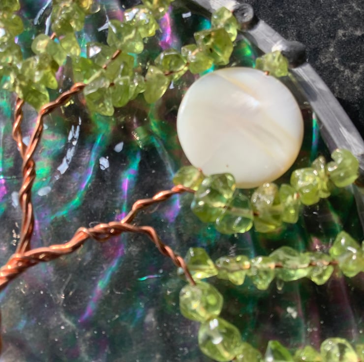 A peridot tree of life decoration that works as a suncatcher or wall hanging.
