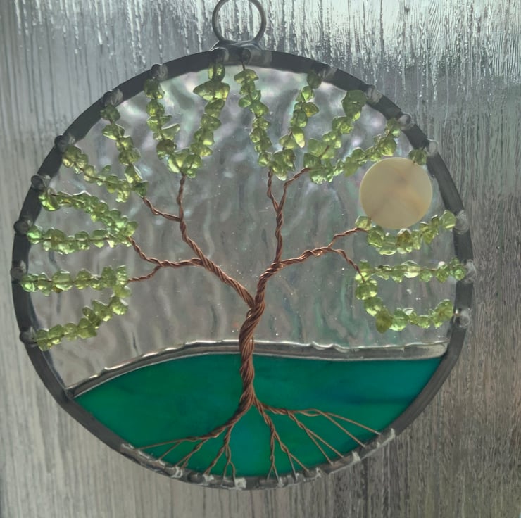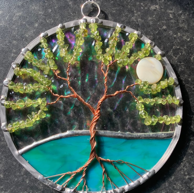 The background has an irridised textured clear glass with a green/blue mix base that have been foiled and soldered together . There is a twisted copper wire tree with branches filled with peridot gemchips and the panel is edged with a traditional lead came channel.