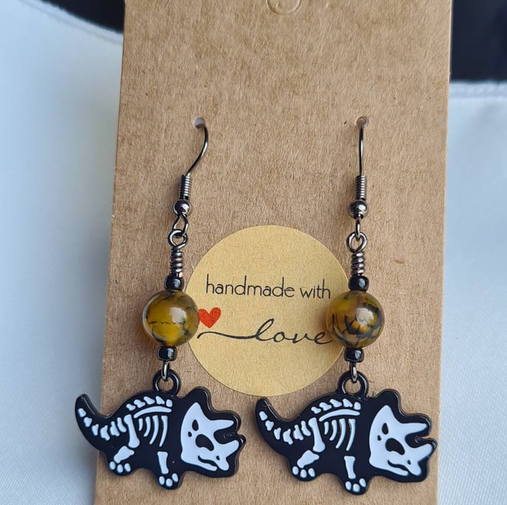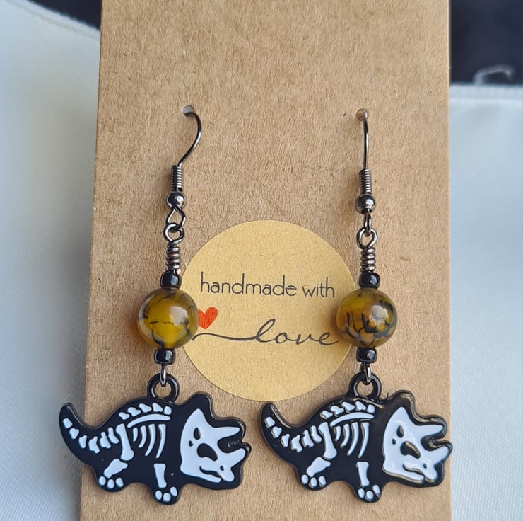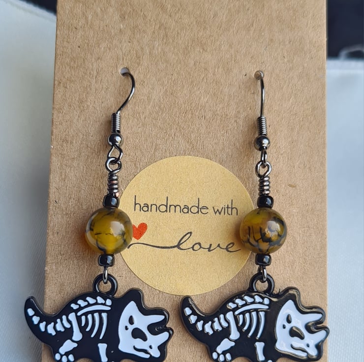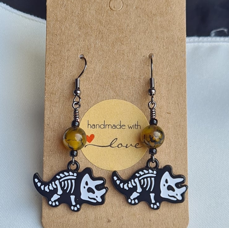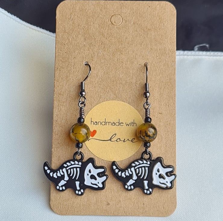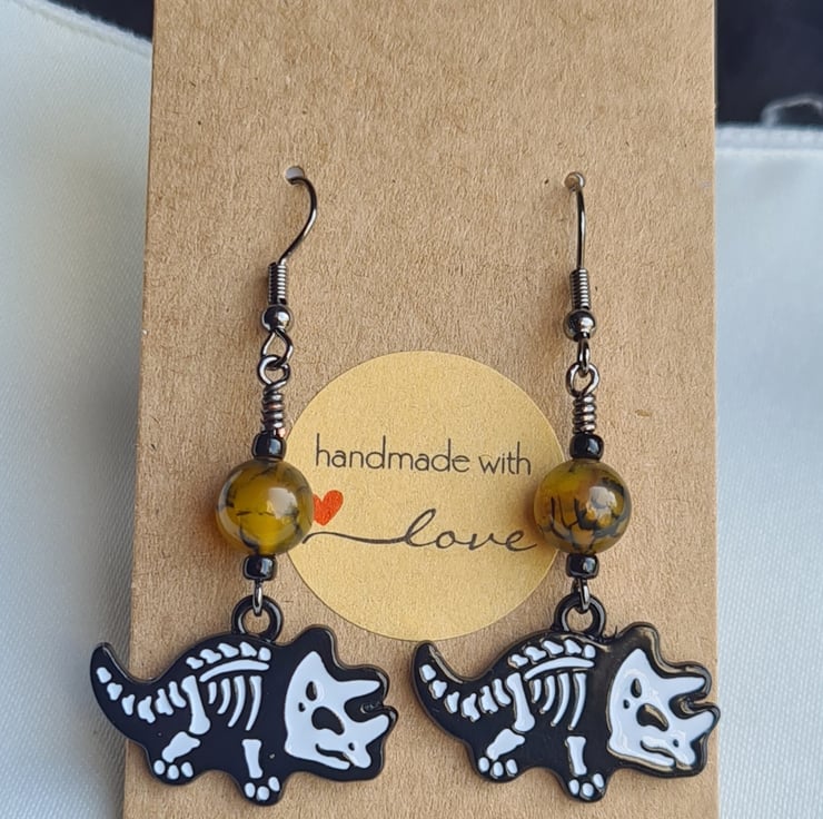 A fun and quirky pair of dangly Triceratops skelly earrings. Great for Dinosaur fans, Archaeologist (lol) or those who love unusual jewellery.