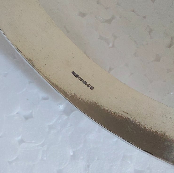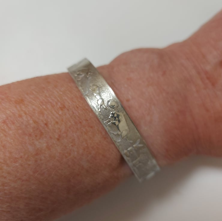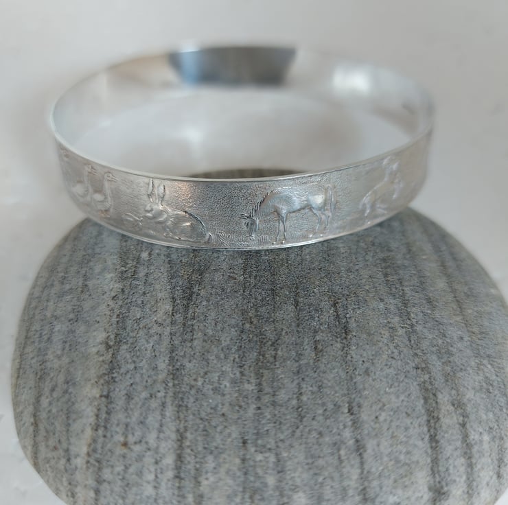 Sterling silver bangle imprinted with a farm animal pattern including horse, cow, pig, dog, goose, rabbit and farmhouse. This is a round bangle, 10mm wide, with an internal diameter of 66mm which will fit a medium wrist. The bangle has been hallmarked by the London Assay Office and has a polished finish. It will be packaged in a smart cardboard box and delivered by Royal Mail first class