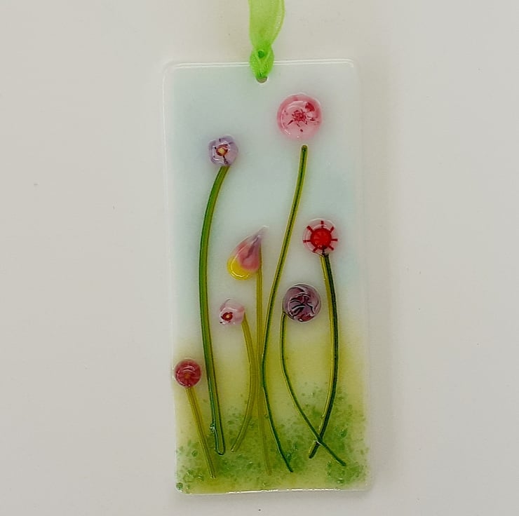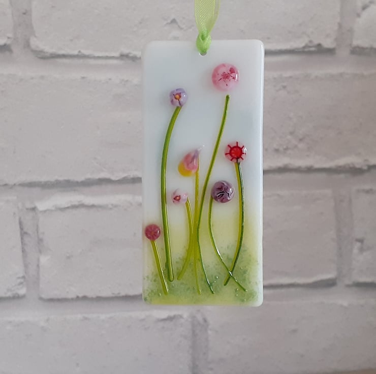 Fused glass miniature hanging decoration depicting a selection of flowers in pink and purple shades, and which would make a lovely little keepsake gift.