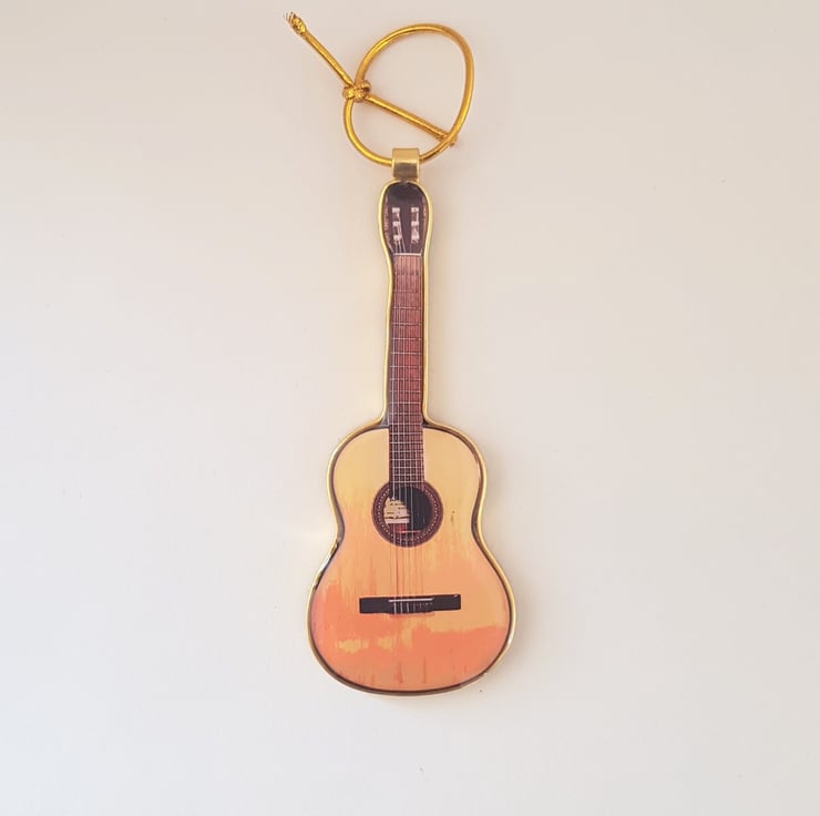 This cute hand made guitar decoration is made from resin and set in gold coloured metal. It comes with an elasticated hanger so it can be hung in your home. The guitar measures 100mm long x 38mm wide.