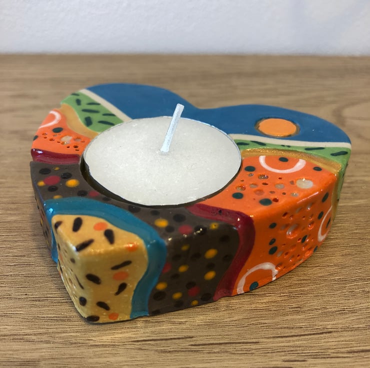 Inspired by the earth, this handmade ceramic stoneware heart shaped tea-light holder has been carved and underglaze painted in beautiful earthy colours to represent strata, all set off with a burning orange sun.