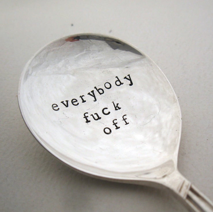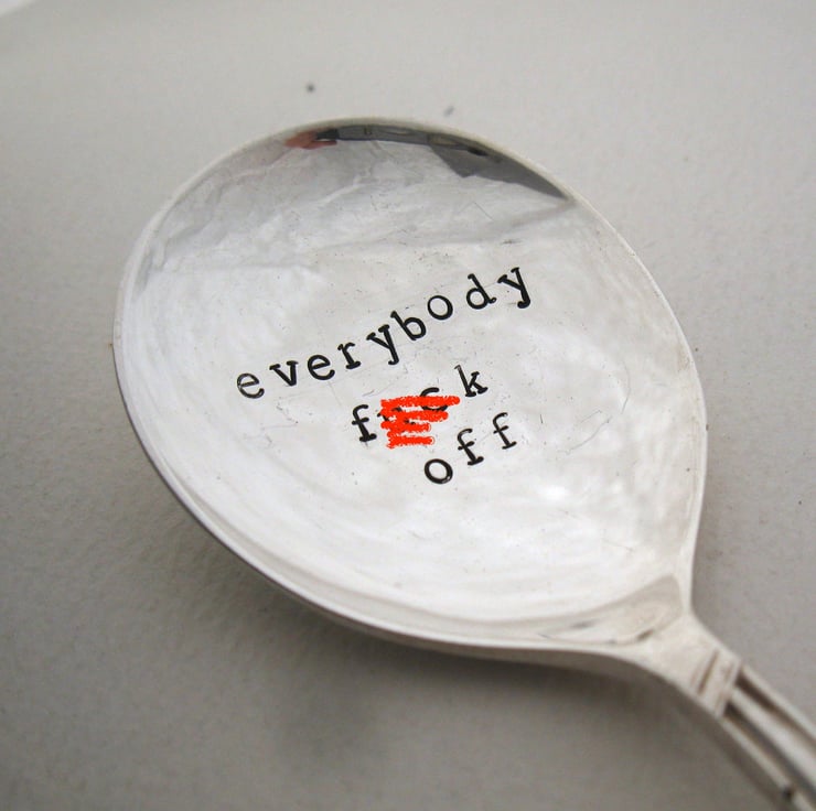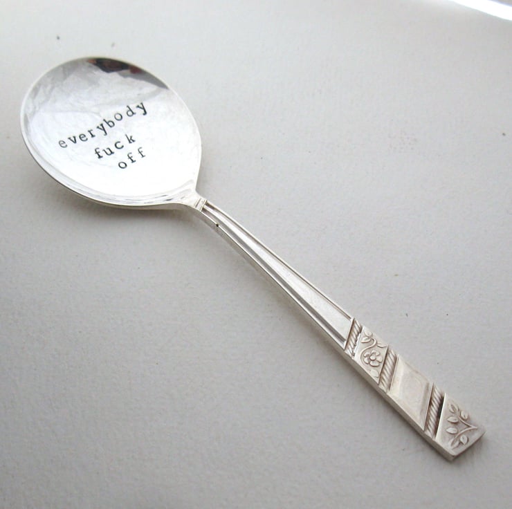 Please read no further if the F-Word offends you... A hand stamped vintage silver plated fruit spoon with a short and pithy message - 'everybody f-ck off' - in black lowercase lettering in the bowl. It's a nice round shallow spoon measuring approximately 5 1/2" (14cm) long and it has a pretty floral detail on the handle.