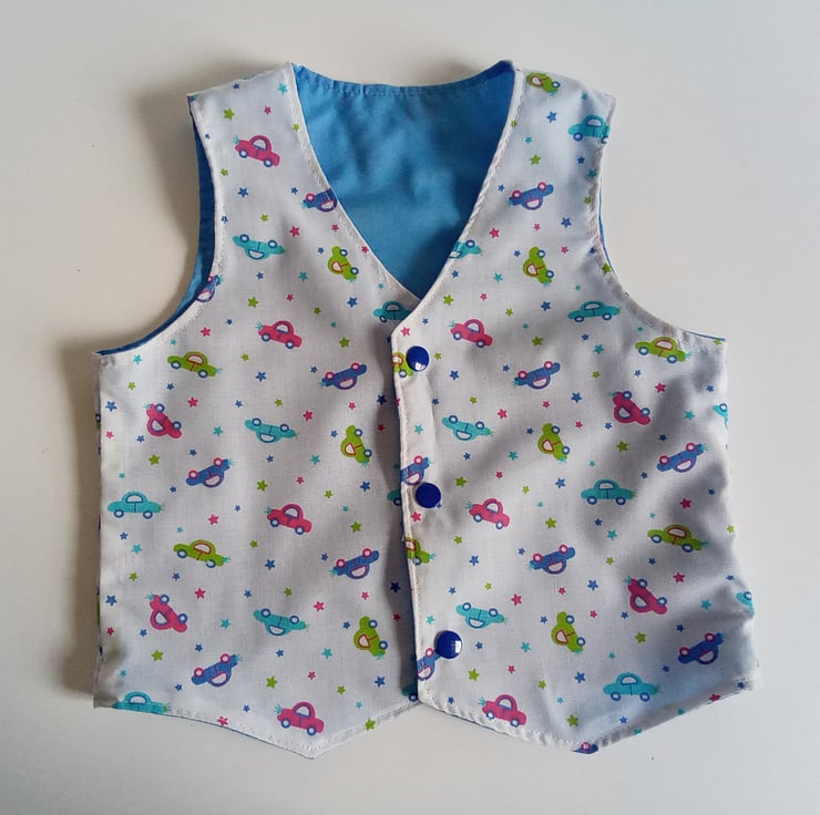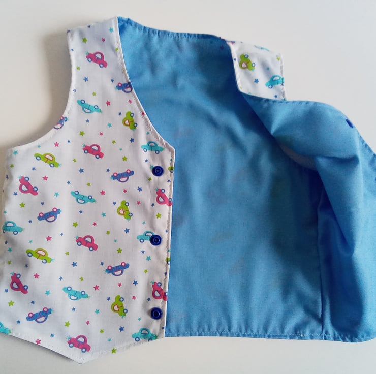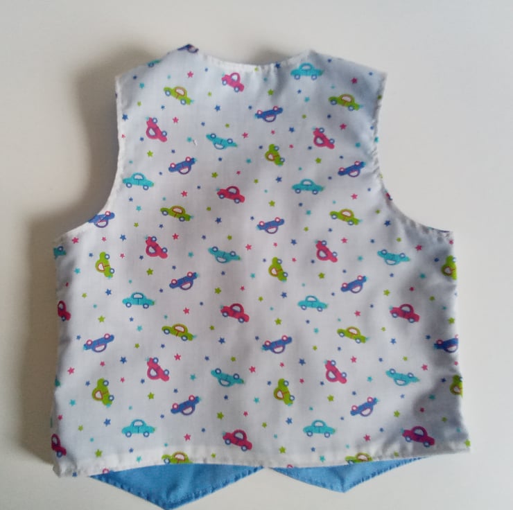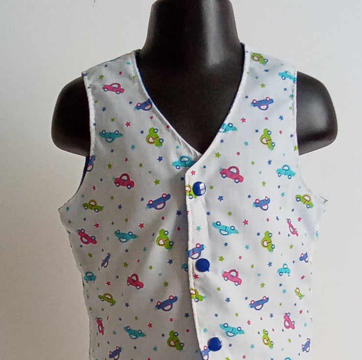 A Waistcoat for boys in a car themed design Polycotton fabric.