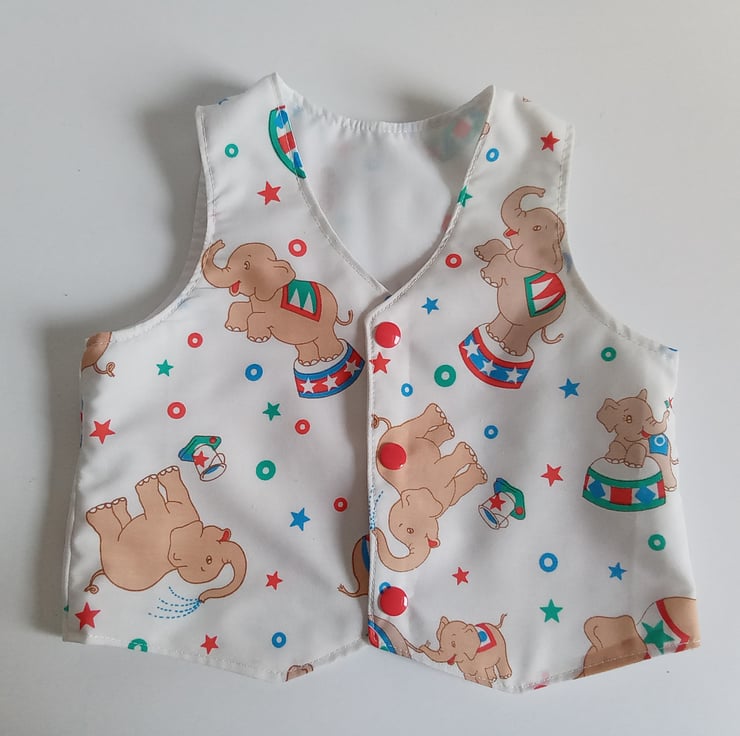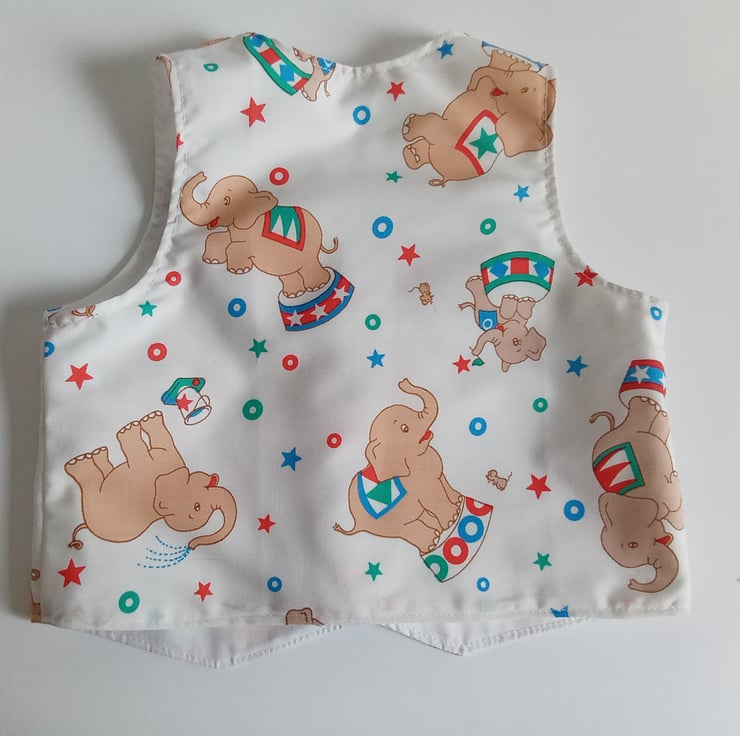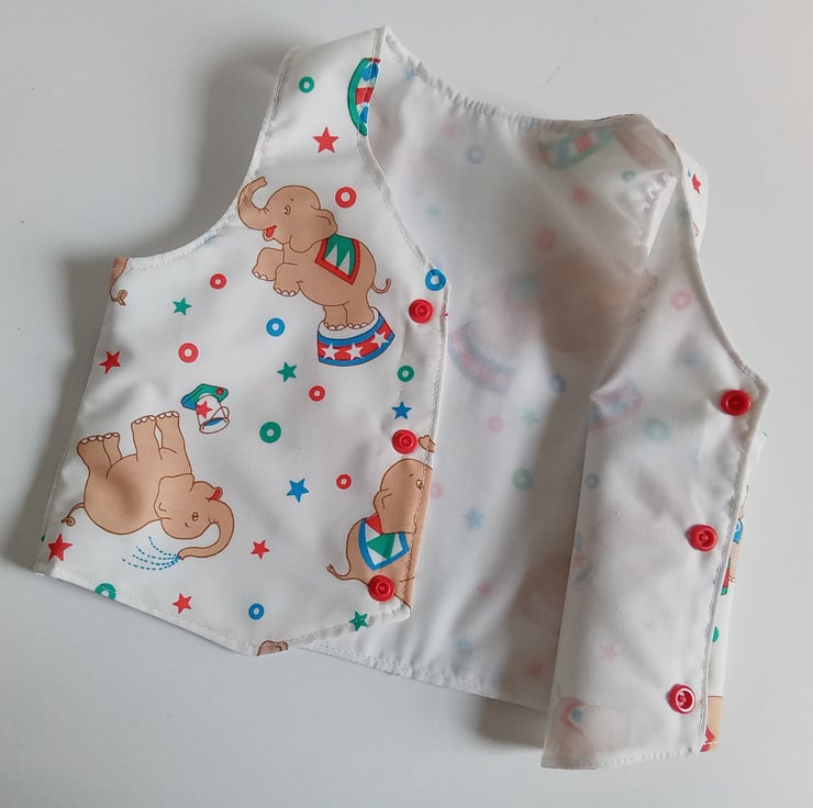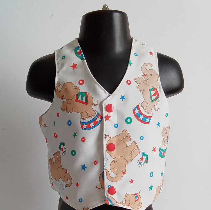 A waistcoat for boys, fully lined, with plastic poppers. It features circus Elephants in various poses.