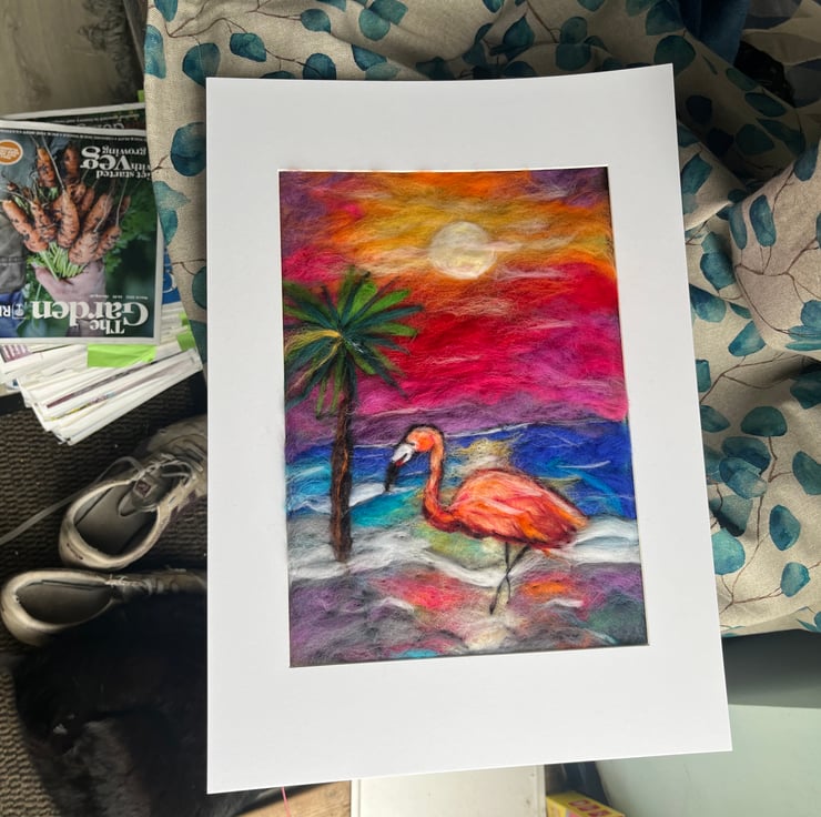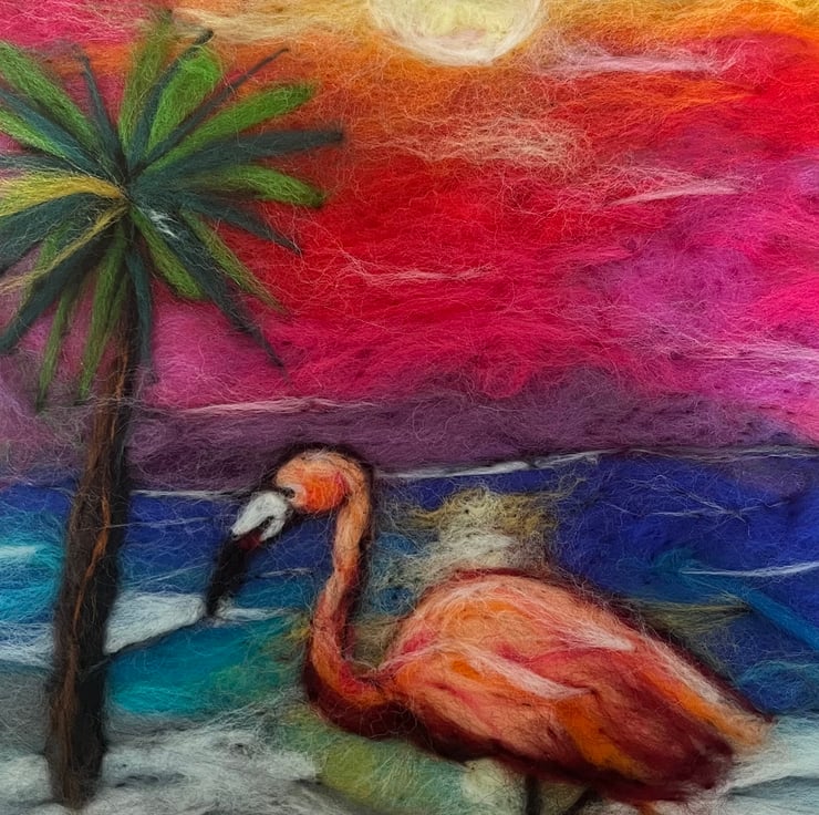 Original handmade, needle felt wool painting of a flamingo wading on the shore in front of a glorious sunset! Add a drop of colour to your walls! A3 when mounted