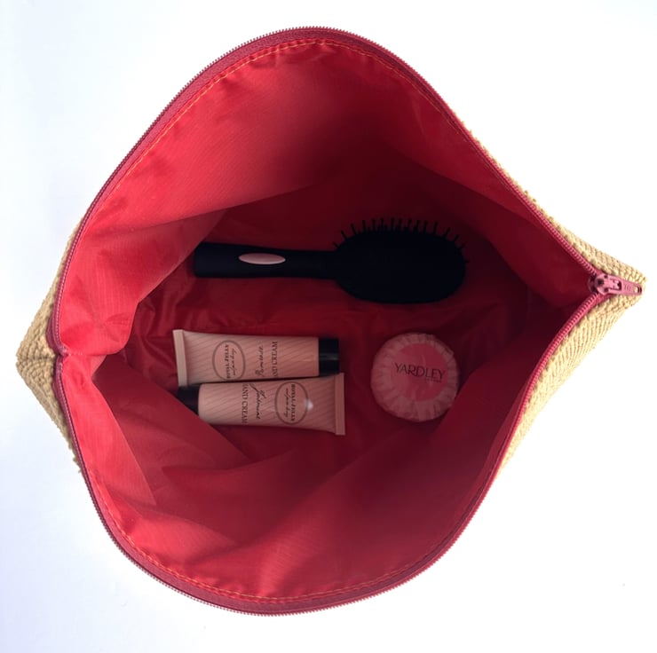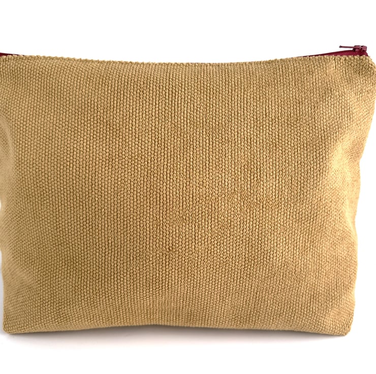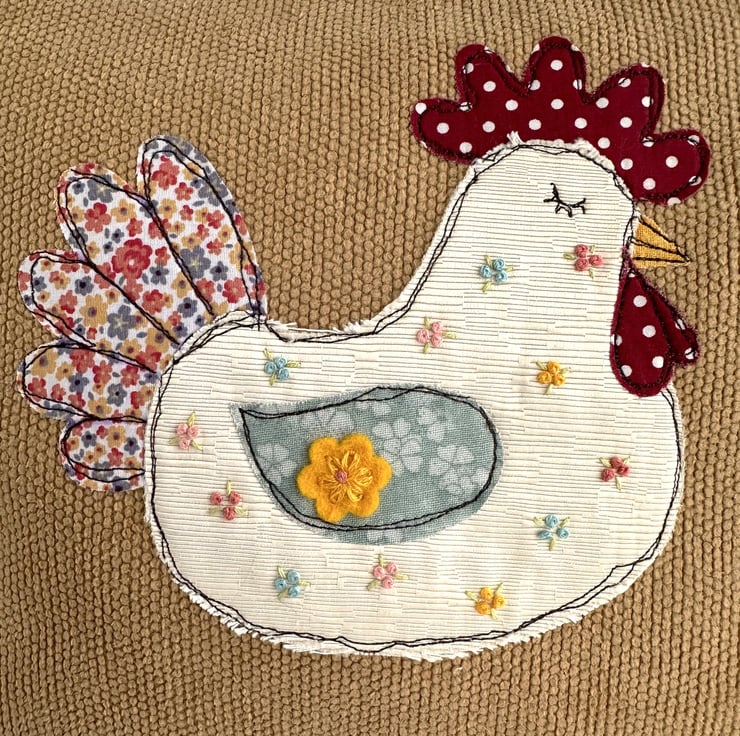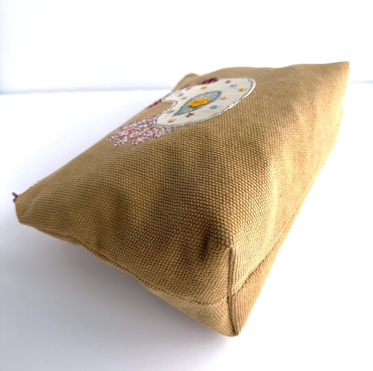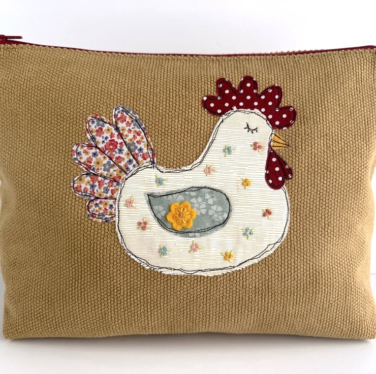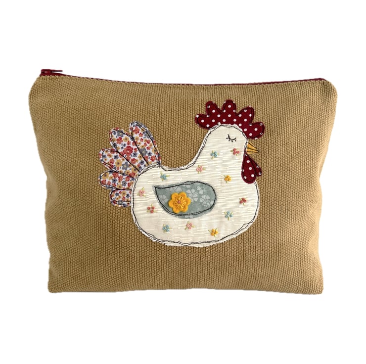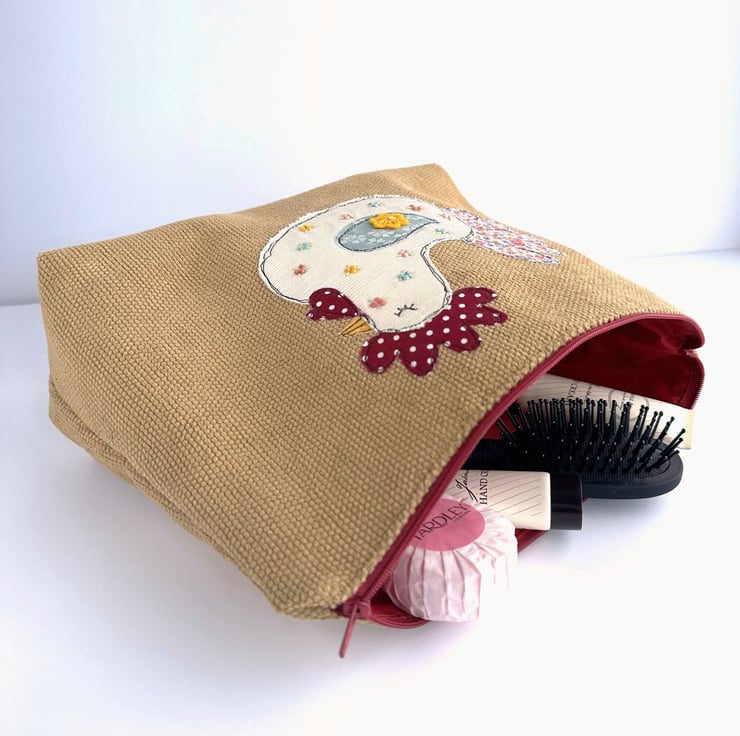 Toiletry bag with floral chicken. This lovely wash bag is made from textured golden-beige upholstery fabric with an appliqué and hand embroidered chicken. The main body of the chicken is made from cream fabric with a slight sheen and a subtle stripe pattern in the weave. I’ve decorated the plain cream of the chicken’s body with a scattering of tiny hand embroidered flower clusters in shades of coral pink, pale salmon pink, golden yellow and pale blue. I’ve also added tiny pale green leaves. The chicken’s tail feathers are made from a pretty print fabric with a pattern of ditsy flowers in salmon, golden-yellow and grey. She has a duck-egg blue wing with a subtle floral pattern, to which I’ve added a golden-yellow felt flower, hand embroidered in place. She has a dark red comb and wattles with white polka dots, and a golden-yellow beak. I’ve outlined her with free-motion embroidery, which I’ve also used for her sleepy closed eye and eyelashes. The bag fastens with a dark red zip and is lined with red water-resistant fabric. The base of the bag is boxed to give extra space inside.