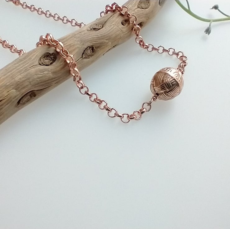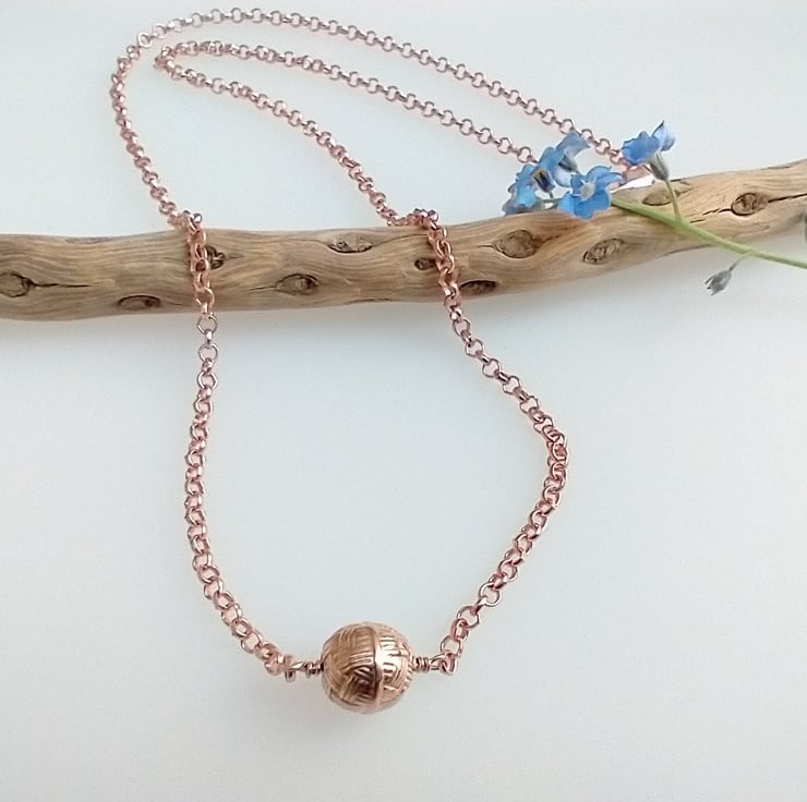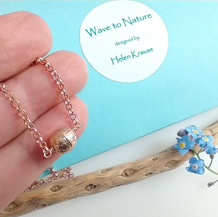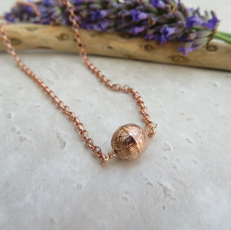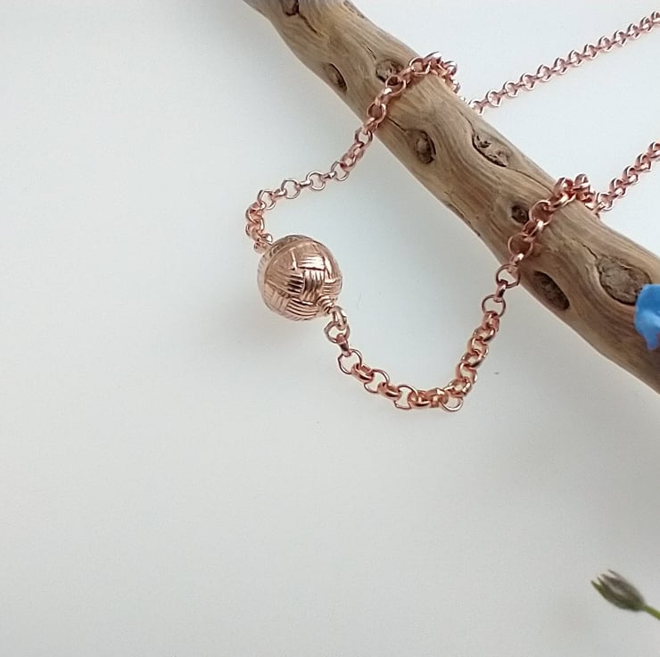 This is a beautiful minimalist necklace made from rose gold plated sterling silver components including a woven ball focal bead on a rolo chain. It comes in two lengths and is secured by a rose gold plated sterling silver lobster claw clasp too. This necklace would look great worn on its own or layered with other length necklaces for an evening out.