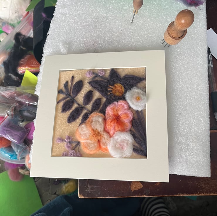 Handmade original needle felt wool painting miniature 20cm x 20cm in mount. Based on a colour scheme for wedding bouquet.