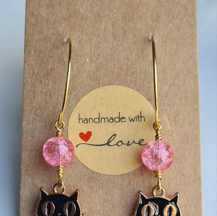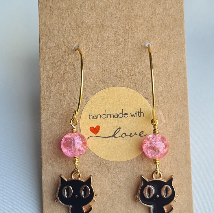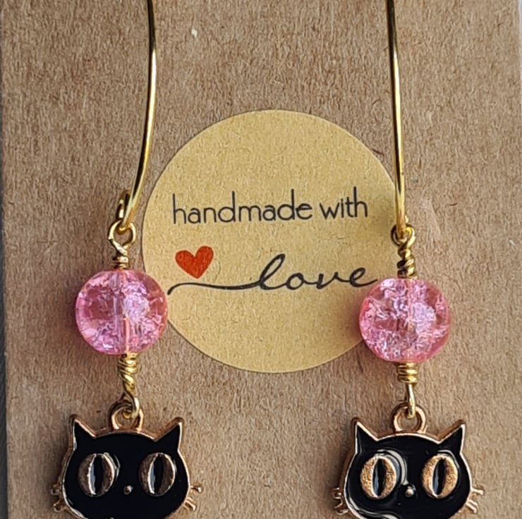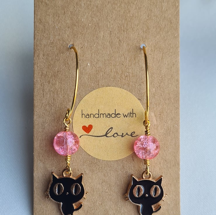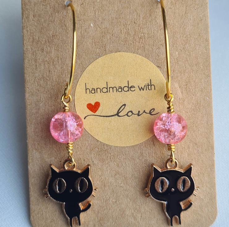 Cute Black Cat charm earrings with Pink crackle glass beads and golden tones. Lovely as a cute gift.