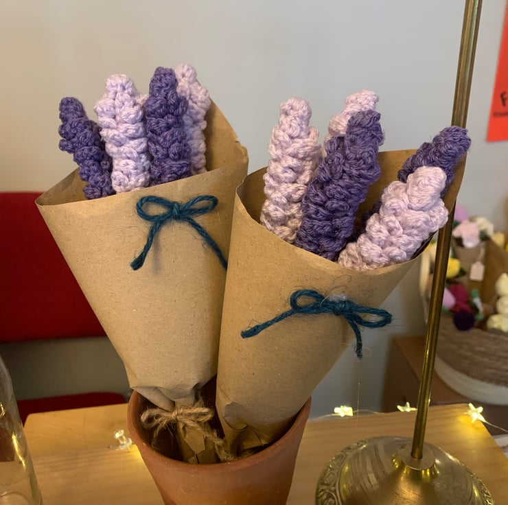 Crochet lavender bouquet. 5 stems of lavender come together to make this delicate mini bouquet. Standing 23cm tall this pretty bouquet is ideal for that small vase that needs a flower. Each bouquet is finished with a rustic ribbon to make it a lovely present for a friend,as a wedding gift or as a thank you. Can be made to order for weddings by sending me a contact message via my shop.