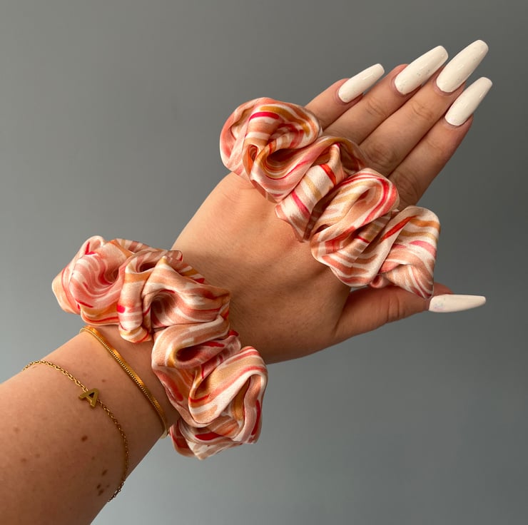 4 digitally printed silk scrunchies.