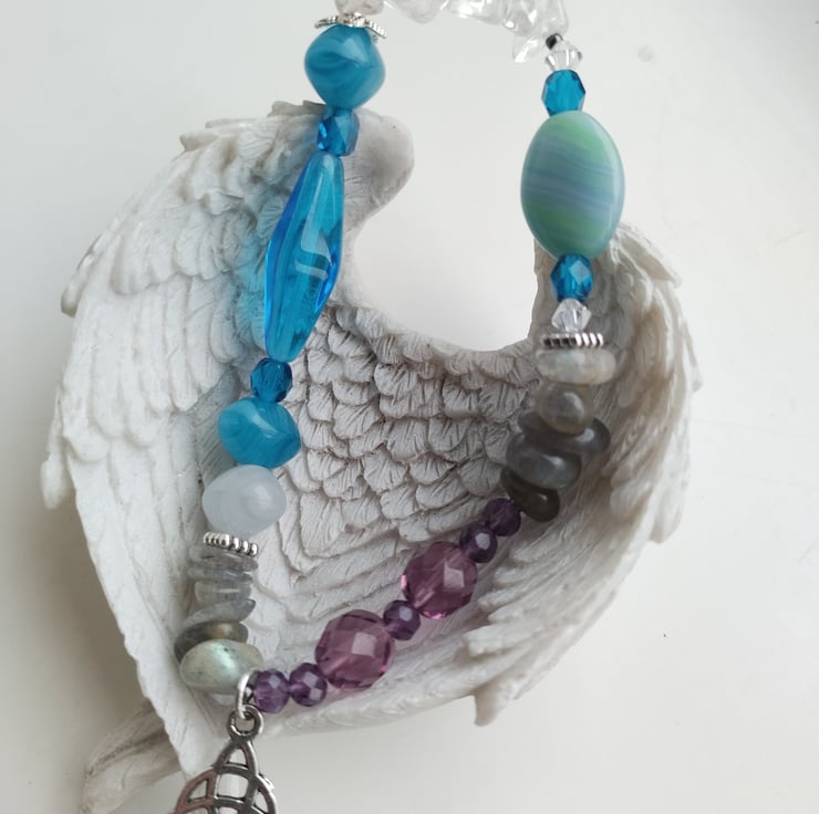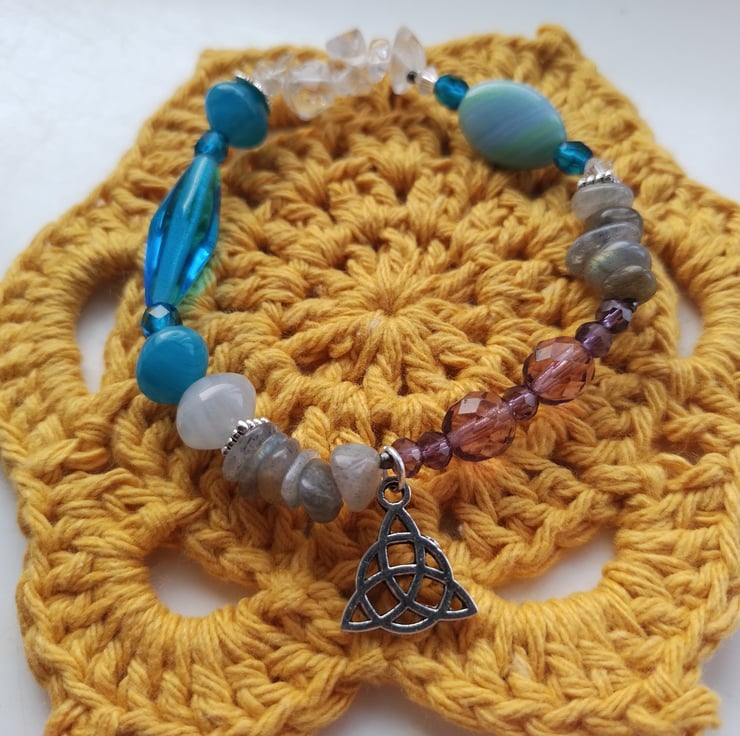 Stretchy bracelet with Clear Quartz, Labradorite and Czech crystals. In addition of purple Czech glass beads with silver tone triquetra charm.