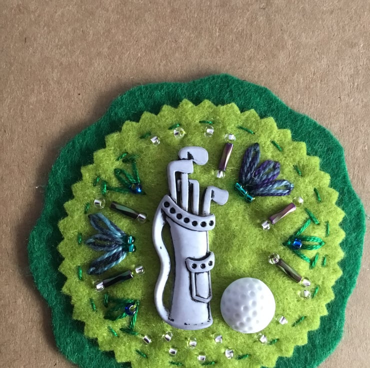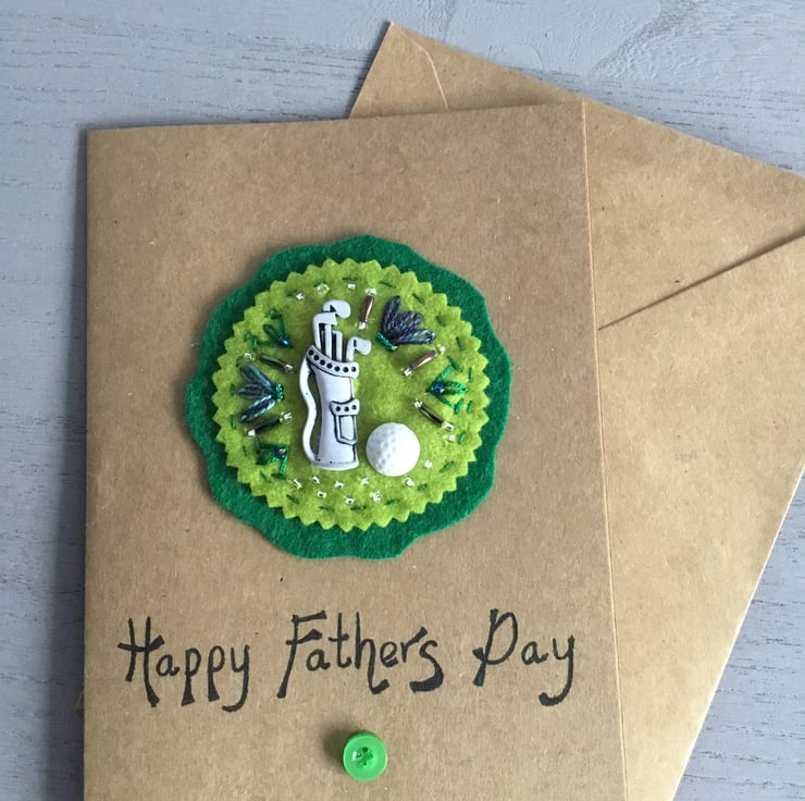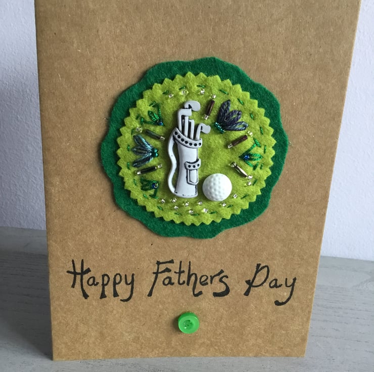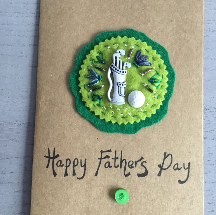 This Hand Embroidered Golf Fathers Day Card is perfect for a Father or Dad who likes to play golf. A golfing scene is hand embroidered on the front of the card. Two Golf related buttons, a Golf Ball and a Golf Ball are stitched onto circles of green felt…..like a golf course green….and surrounded by hand embroidered Running, Fly and Lazy Daisy Stitches with bugle and seed beads.
