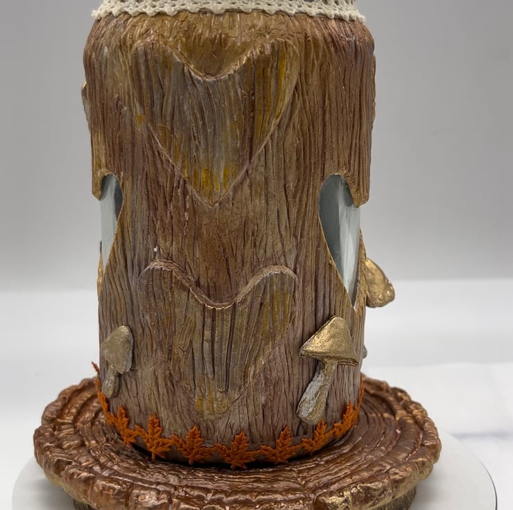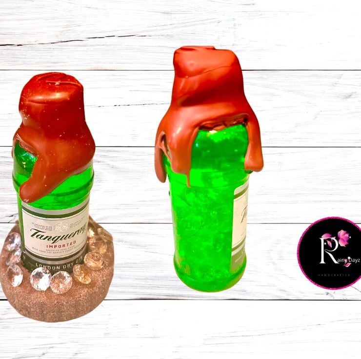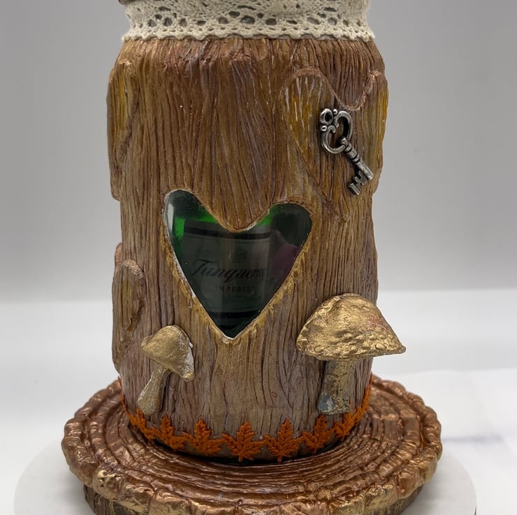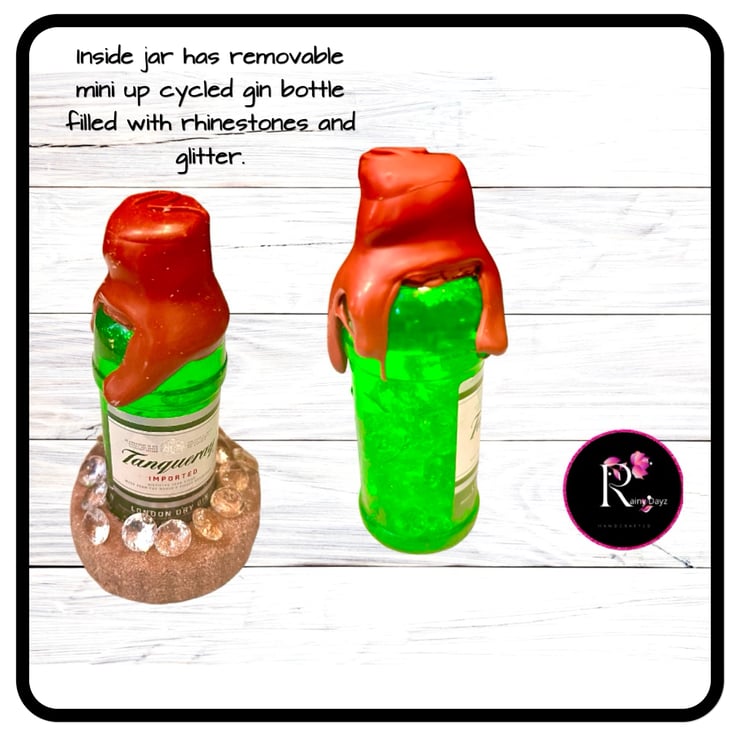 Base of jar detaches from the wood effect log to allow access to the battery operated light. Inside the jar as a removable mini up cycled gin bottle. (Non edible) Can be removed if preferred and jar can be used as a vase. Inset of jar is waterproof, but outside is wipe clean only. Lid of jar is stamped with gorgeous rainy dayz handcrafted logo.