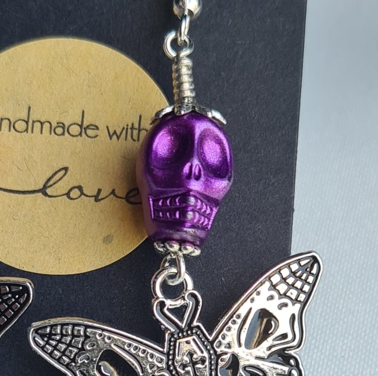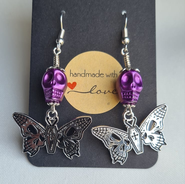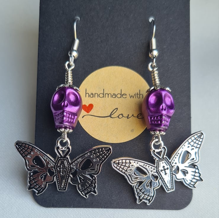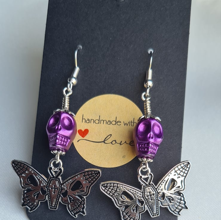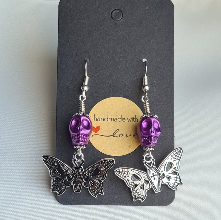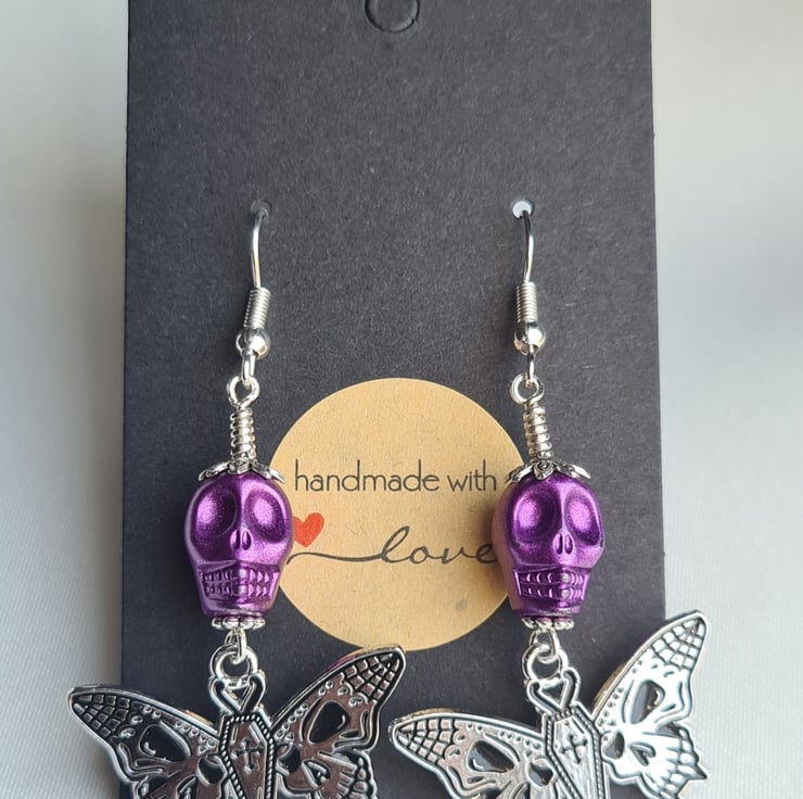 Unusual Butterfly/Skull charms dangling from Purple Skull beads make these earrings a spooky pair with a pop of colour. A great gift for those who love unusual jewellery.