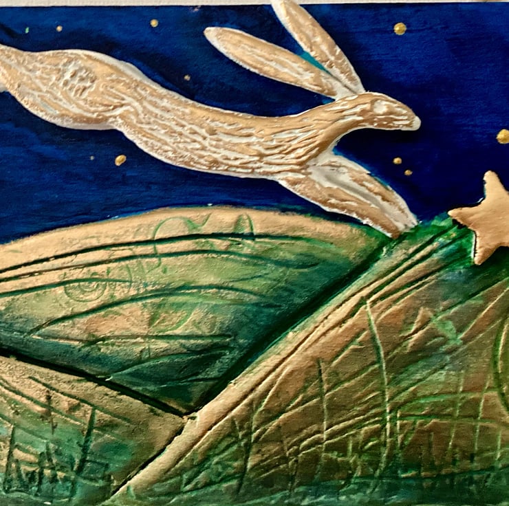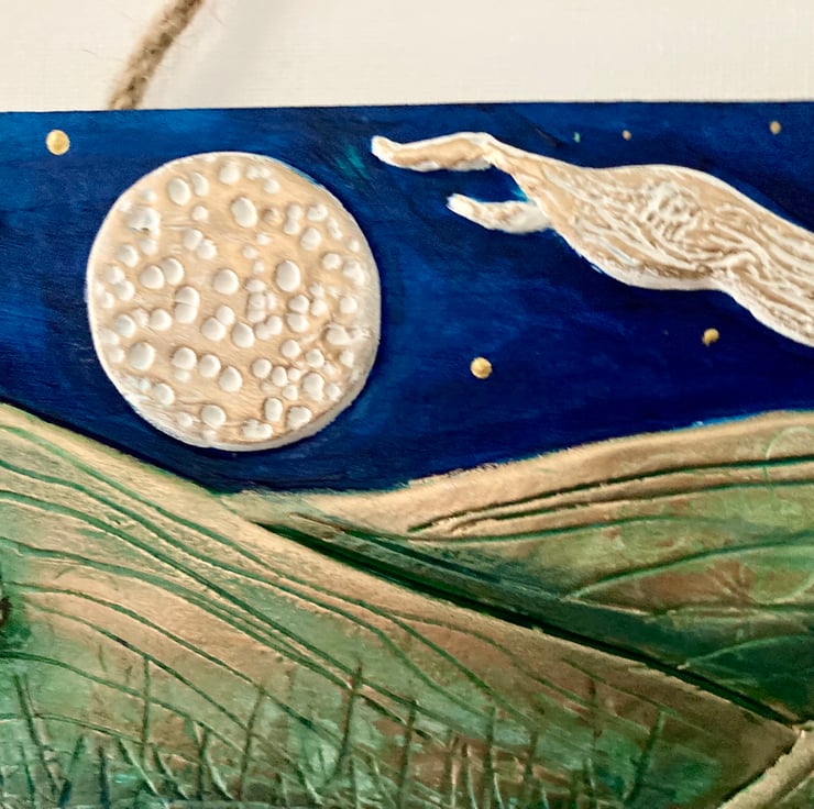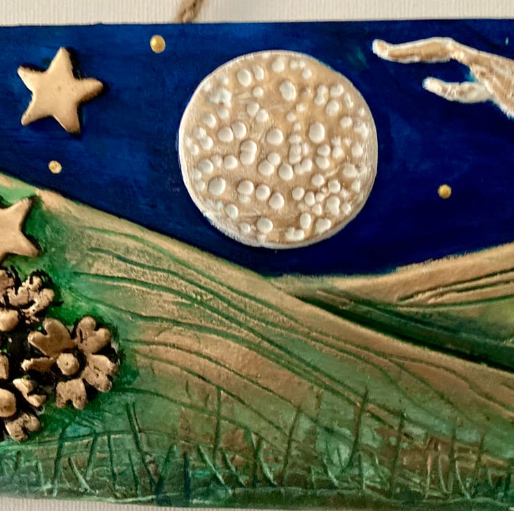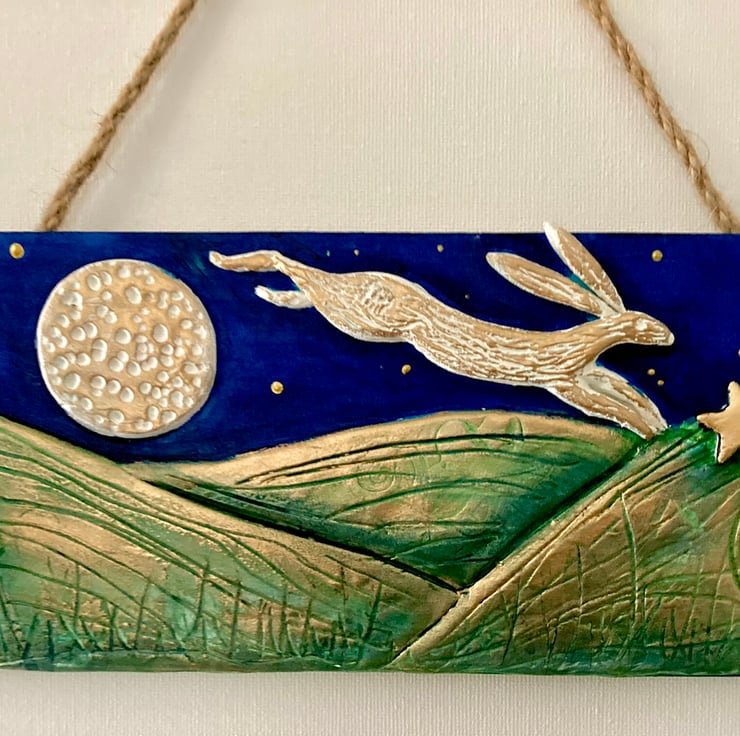 The plaque is wood and I have hand sculpted from air dry clay a landscape, moon and hare and also added gold clay stars.