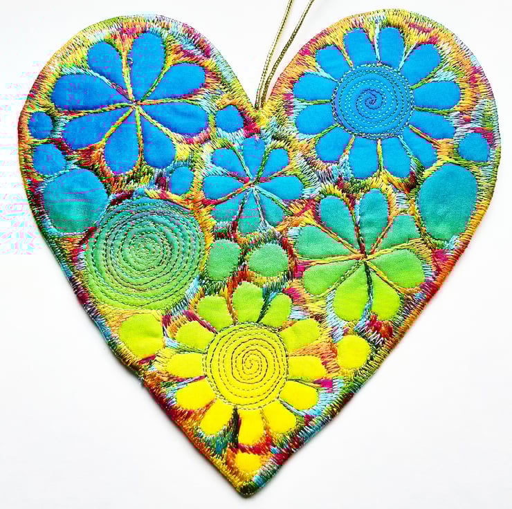 Made from layers of fabric including hand dyed Egyptian cotton and silk fabrics using the free machine embroidery style of sewing