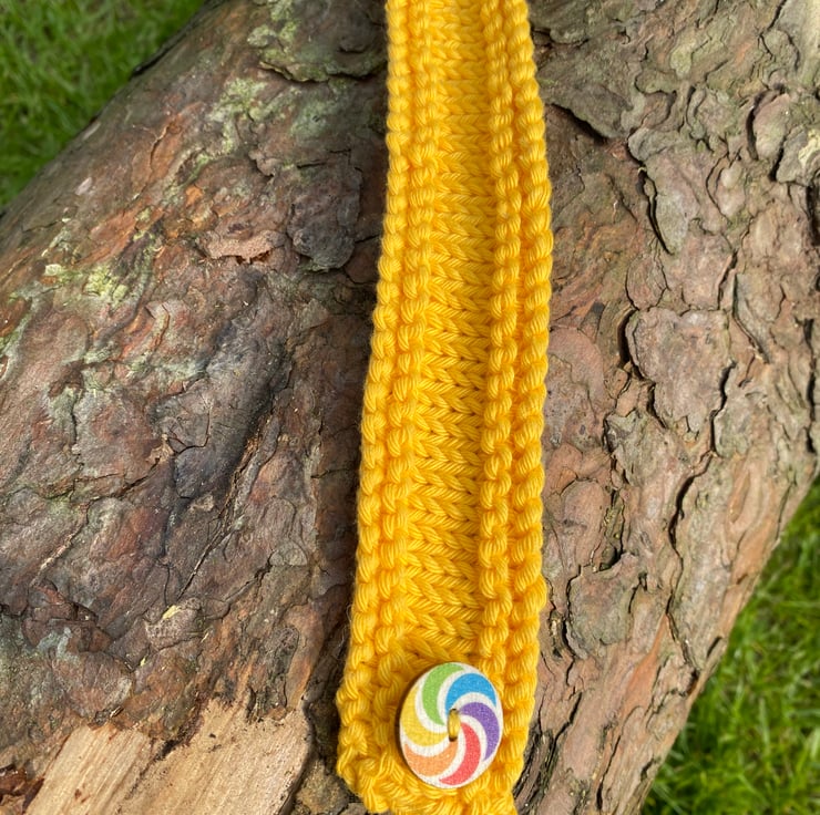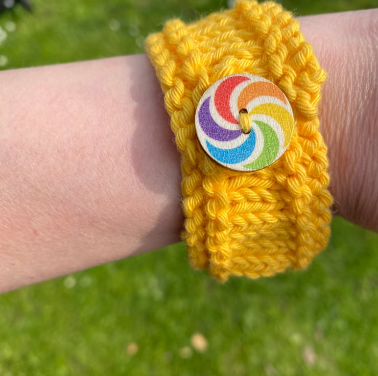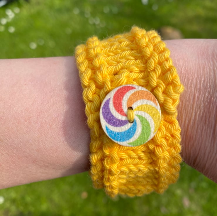Bright yellow cotton bracelet with colourful wooden button. This hand knitted bracelet is made using cool cotton yarn, perfect for summer and festivals, but it’s a year-rounder.
