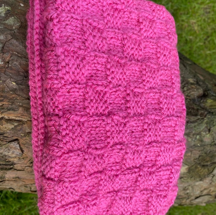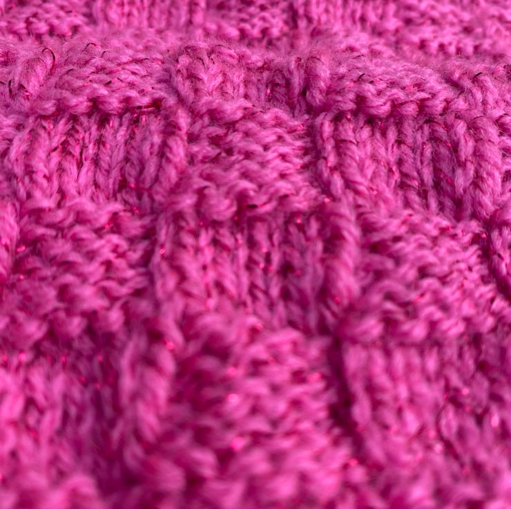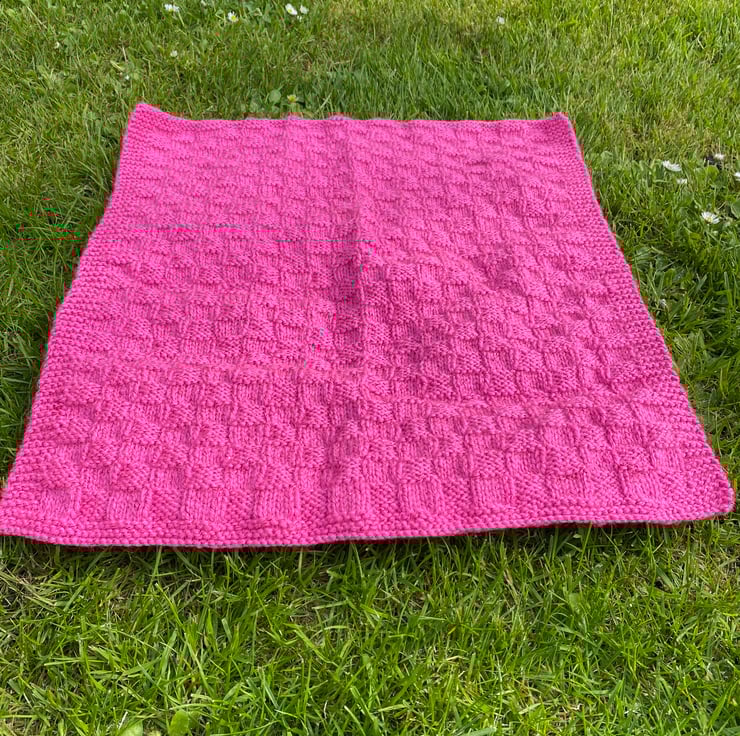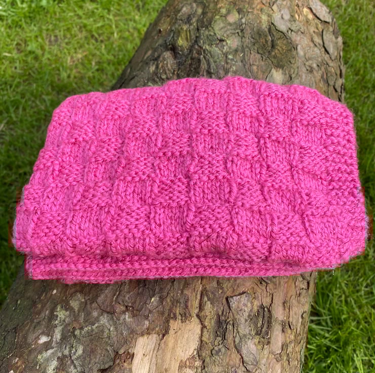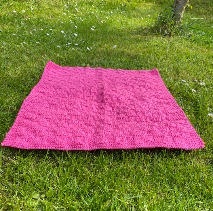 Hand knitted in bright pink yarn with a sparkly pink thread running throughout, this soft blanket is certainly eye-catching, which makes it equally perfect for keeping any beloved doll snuggled up cosy and its owner a proud parent.