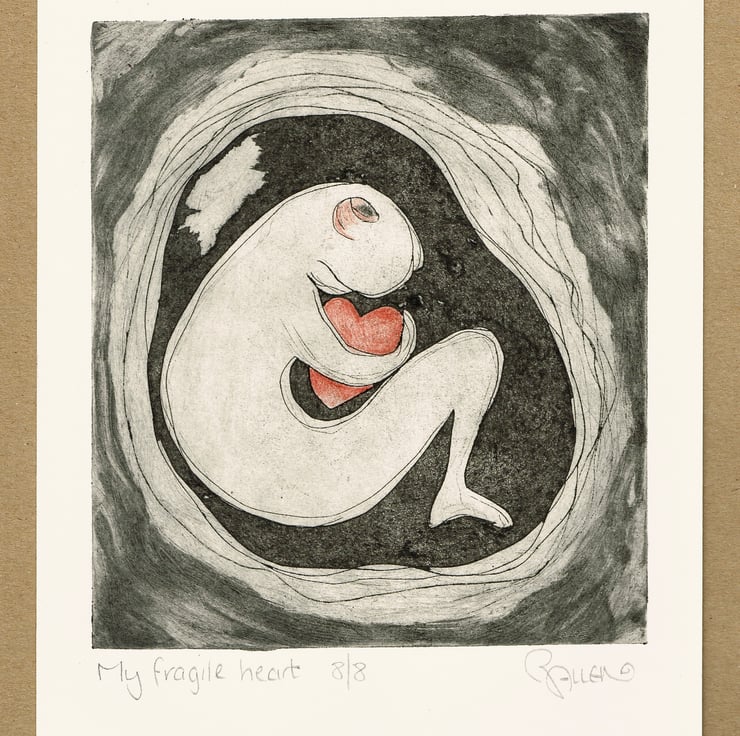 This is a hand printed drypoint etching. Its a limited edition of 8 and this is number 8 of 8. It is printed with black Akua ink and their is a little hand colouring. It is printed on thick cream watercolour paper. It is approx. 21cm x 15cm ( A5 ) and the print area is 14cm x 12.5cm.