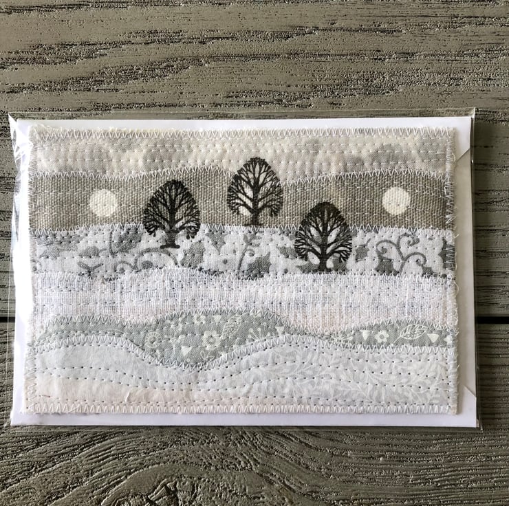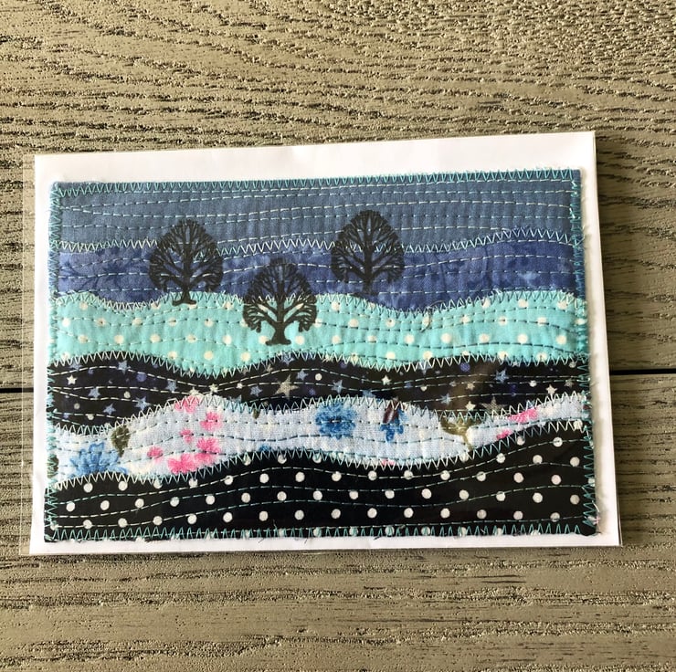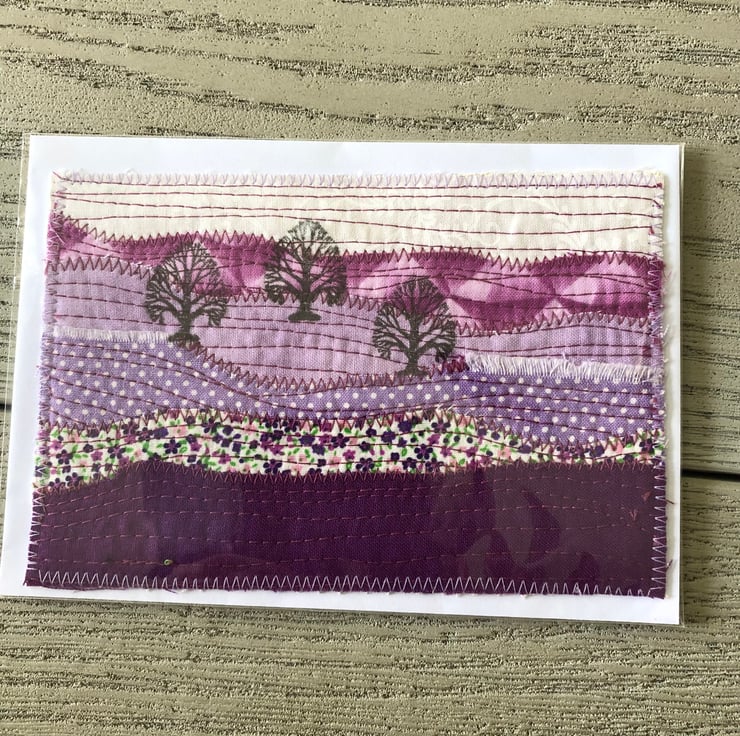 This delightful set of postcards are created from scraps of fabric machine stitched onto a backing fabric and stamped with a an oak tree stamp to produce a country scene view.
