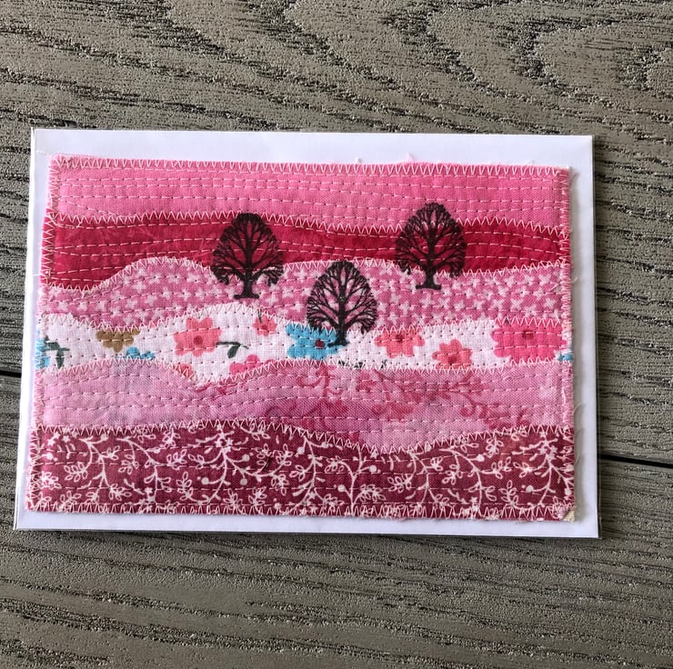 In shades of blue, pink, purple and white each postcard is unique and has a plain white card backing for your message and the edges are finished with a zig zag stitch. Each postcard comes with a plain white envelope.