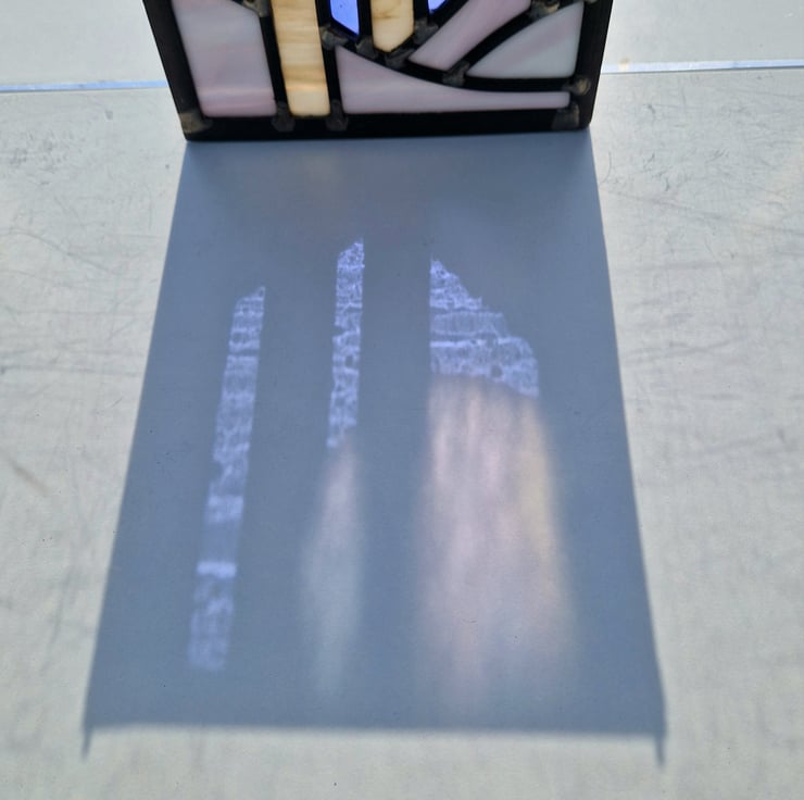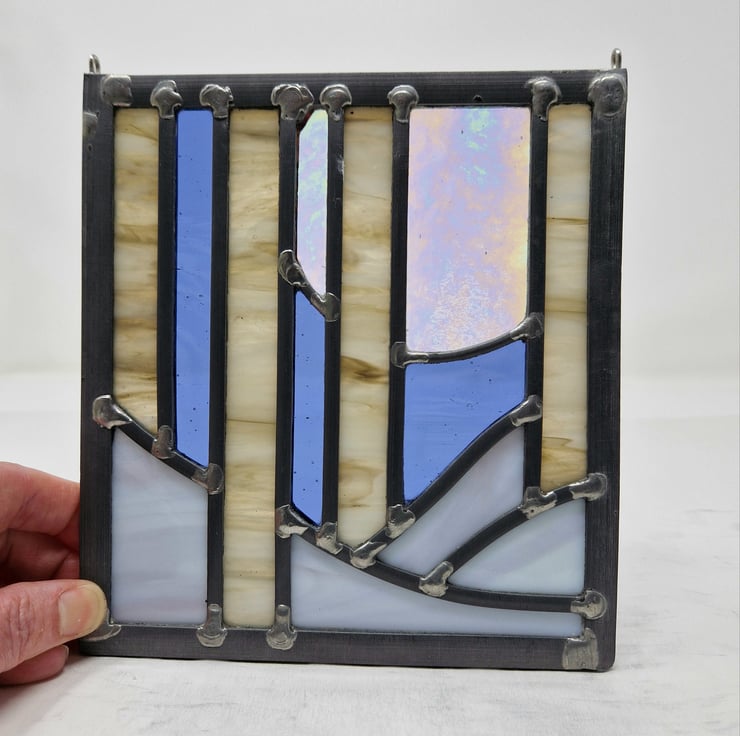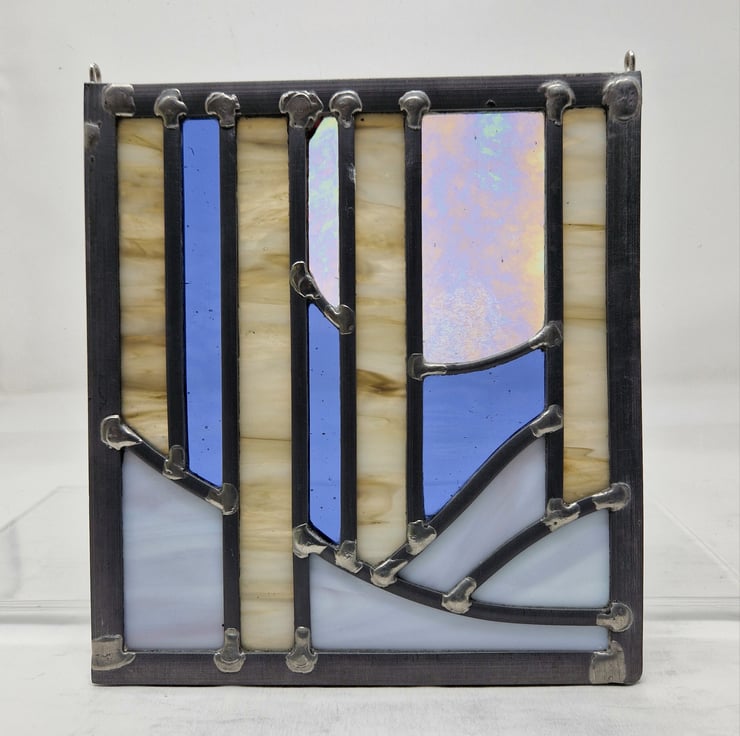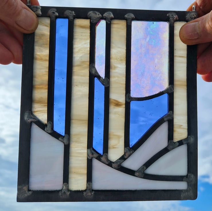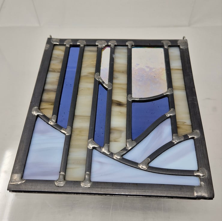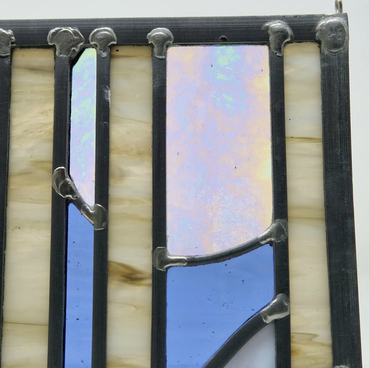 Once cut, the panel is then leaded, soldered and cemented. Hooks have been added for hanging this piece in your window.