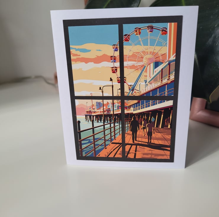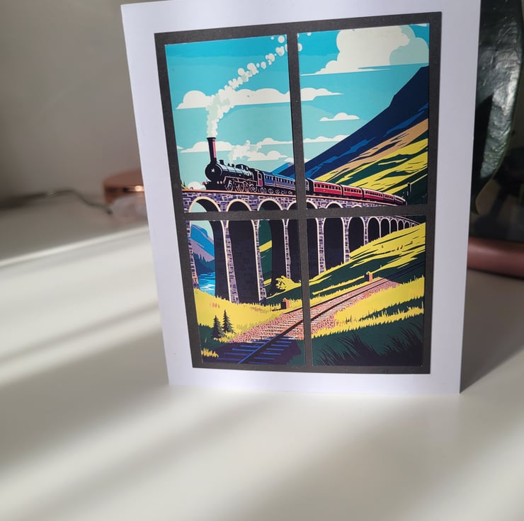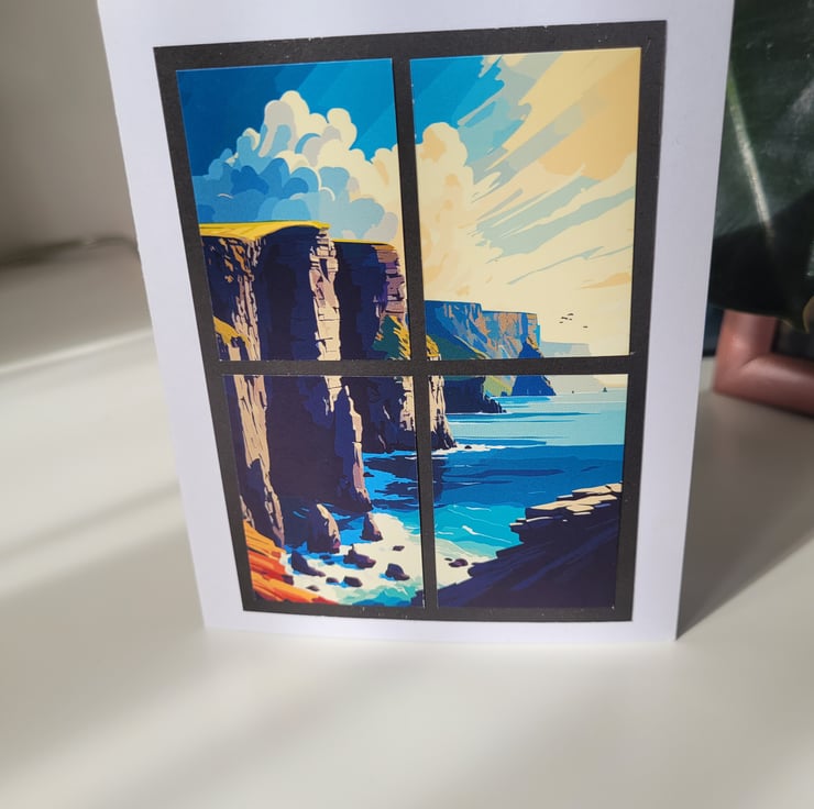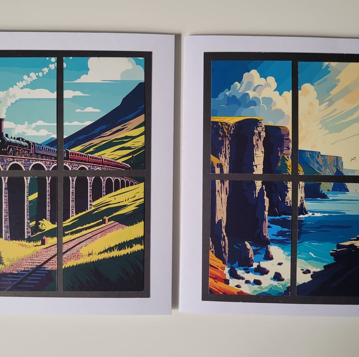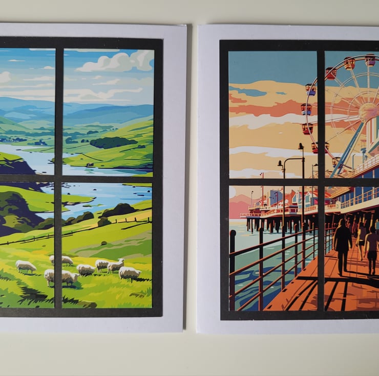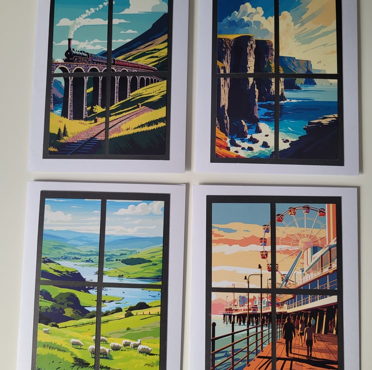 Set of 4 blank cards made from printed (coated) 150gsm paper featuring images of British coastal, country and city scenes, mounted on a black background cardstock to create the impression of looking through a window, atop a white card base. A great set of cards for many and any occasion!