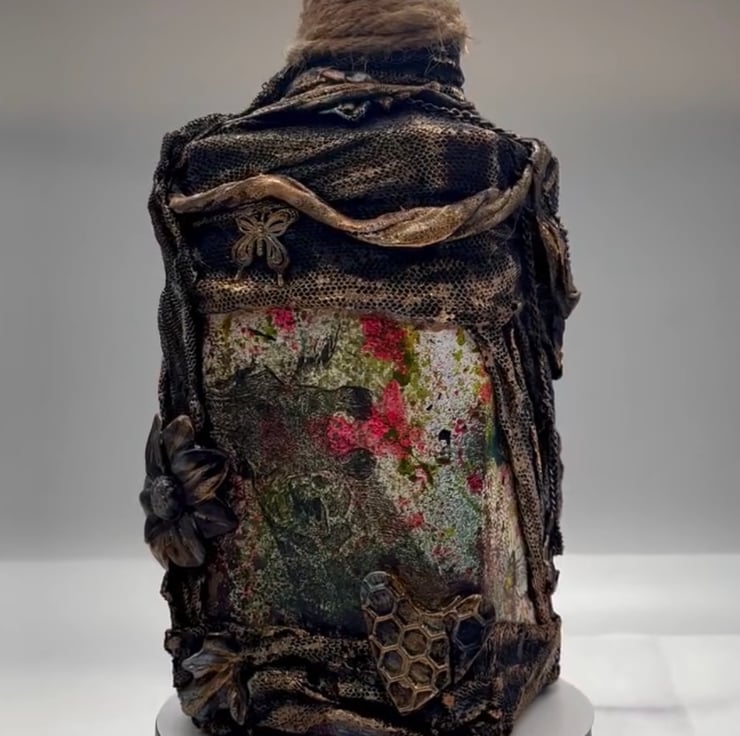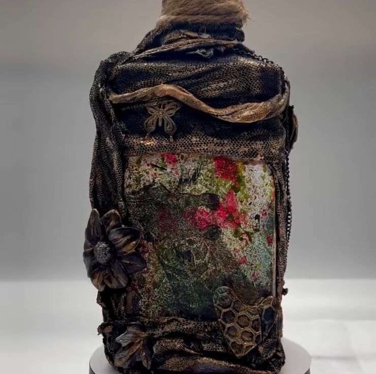 Up cycled Jack Daniel’s bottle giraffe design and hand painted splash background. With 3D effect clay flower and steam punk theme. Neck of bottle has wax and twine finish.