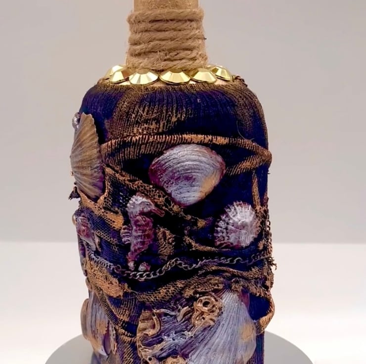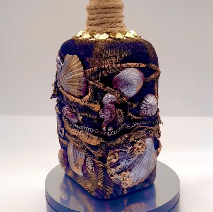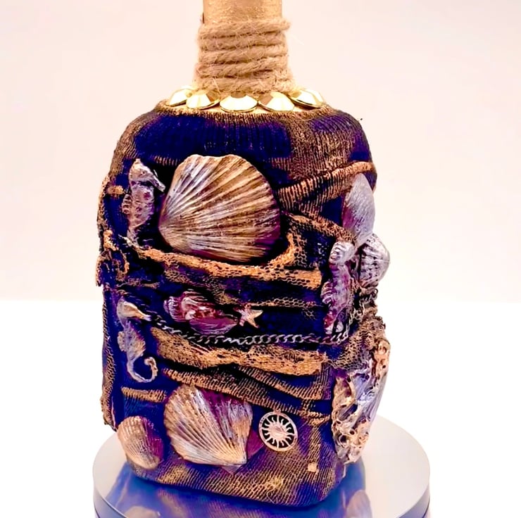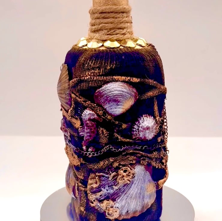 Absolutely stunning one of a kind up cycled beach themed spirit bottle with 3D shells and chain. Bottle is finished off with a beautiful clay rose,