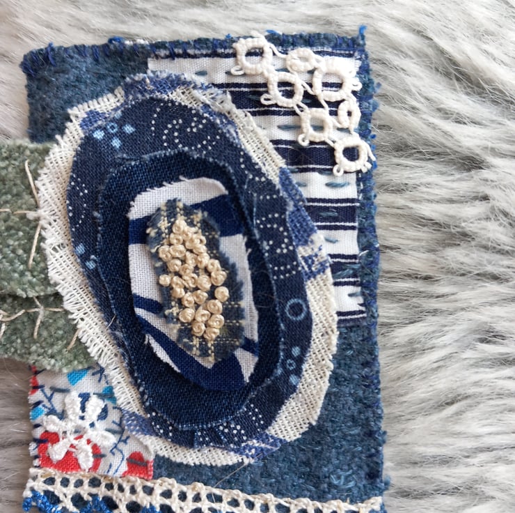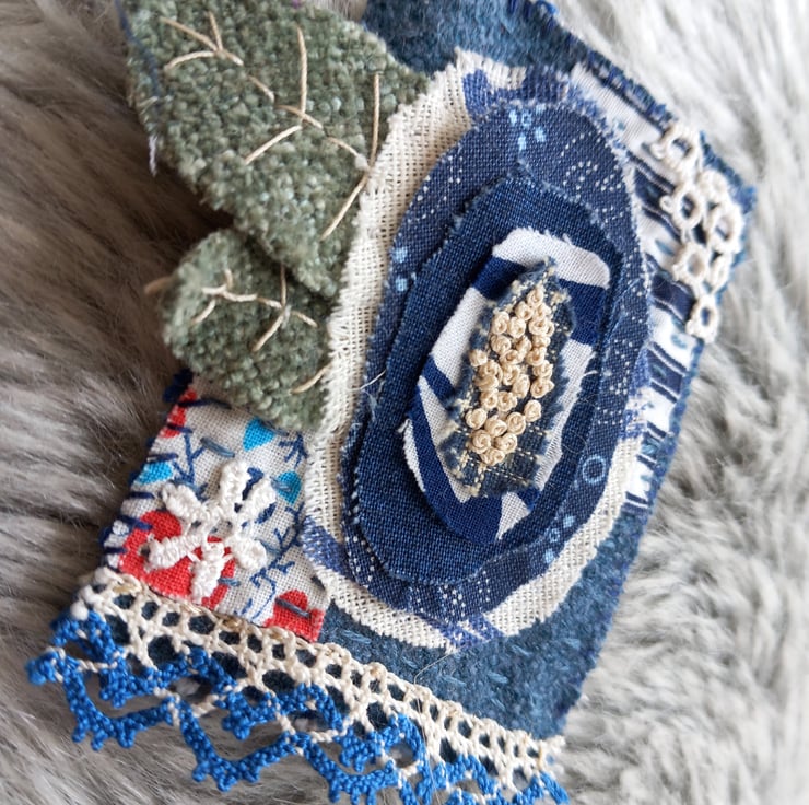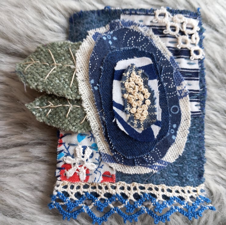 Thus brooch has been made out of scrappy bits of fabric. The base of the brooch front is made from tweed that I've kantha-stitched 2 scraps of fabric onto before adding the 'flower' made by layering decreasing rough ovals on top of each other. I've added a number of french knots to create the flower centre. The leaves are made from chenille fabric. Further decoration has been added using a lace flower, a piece of antique tatting and blue and white lace across the bottom.