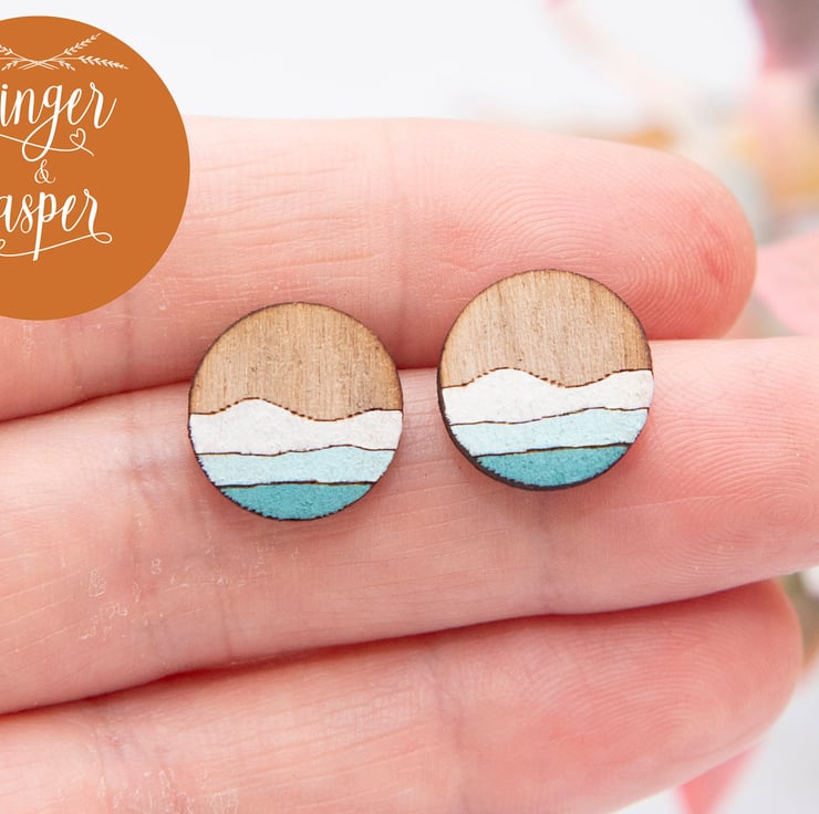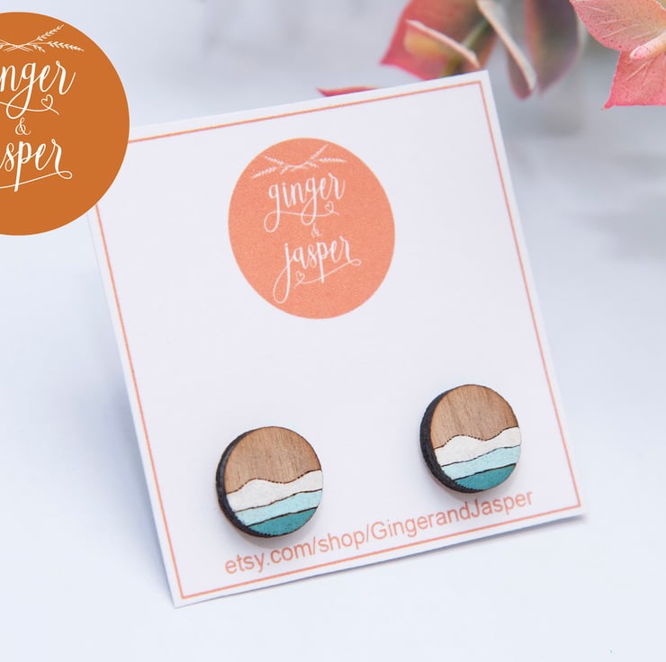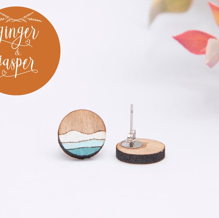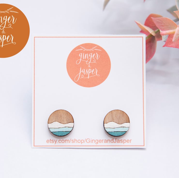 These gorgeous and cheerful, laser cut wooden earrings are engraved with an abstract sea design, hand painted and finished with hypo-allergenic, stainless steel earring posts and butterfly backs. They will be delivered to you on a Ginger & Jasper branded card, as pictured.