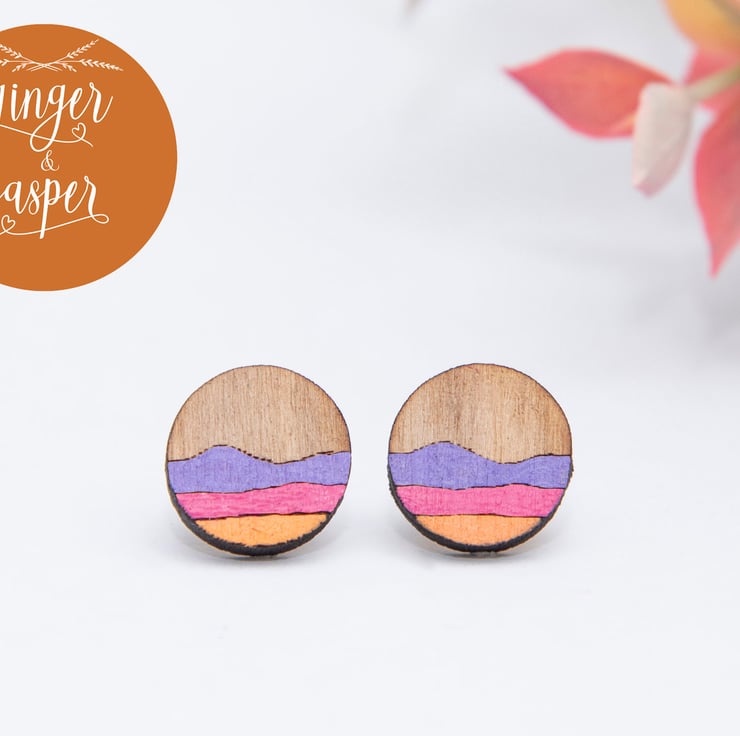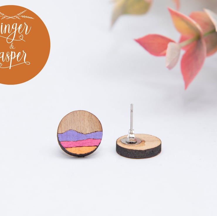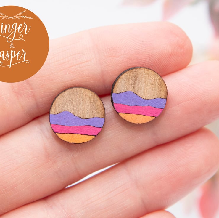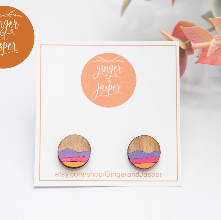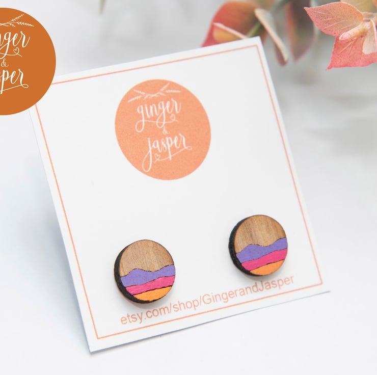These gorgeous and cheerful, laser cut wooden earrings are engraved with an abstract landscape design, hand painted and finished with hypo-allergenic, stainless steel earring posts and butterfly backs. They will be delivered to you on a Ginger & Jasper branded card, as pictured.