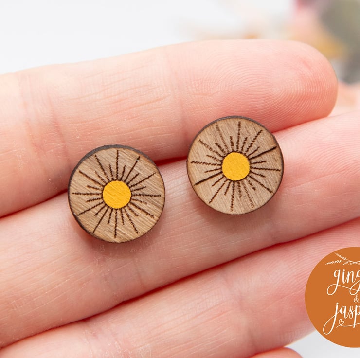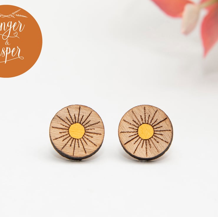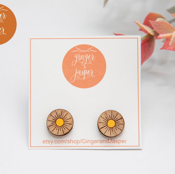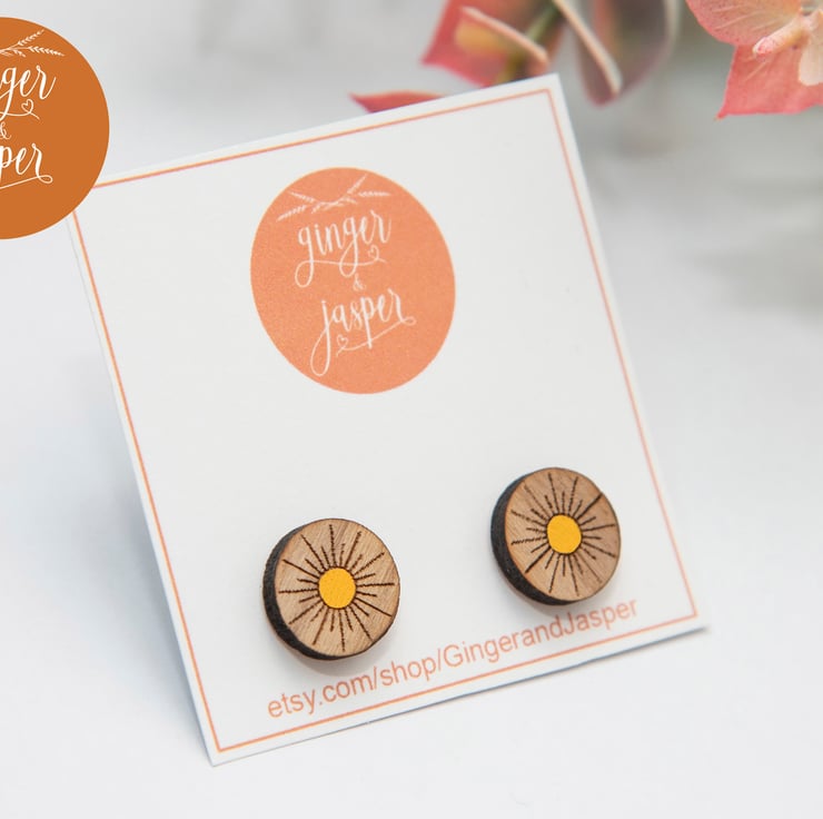 These gorgeous and cheerful, laser cut wooden earrings are engraved with a lovely sunshine design and finished with hypo-allergenic, stainless steel earring posts and butterfly backs. They will be delivered to you on a Ginger & Jasper branded card, as pictured.