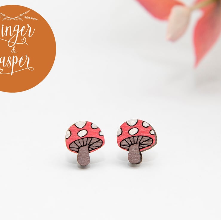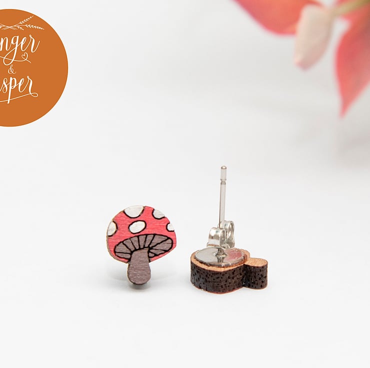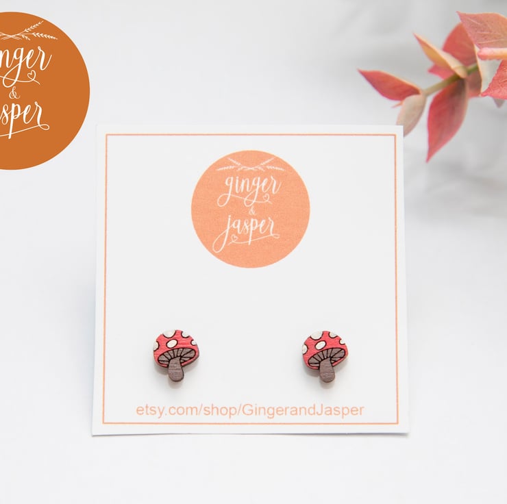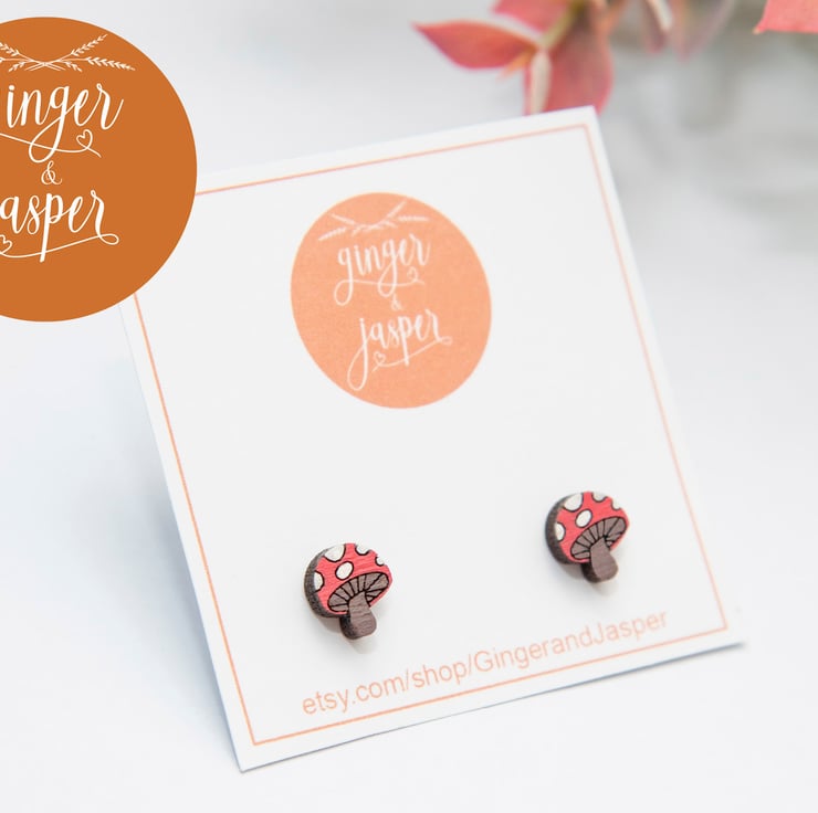 These gorgeous and dainty, wooden toadstool, mushroom earrings are hand-painted and finished with hypo-allergenic stainless steel earring posts and butterfly backs. They will be delivered to you on a Ginger & Jasper branded card, as pictured.