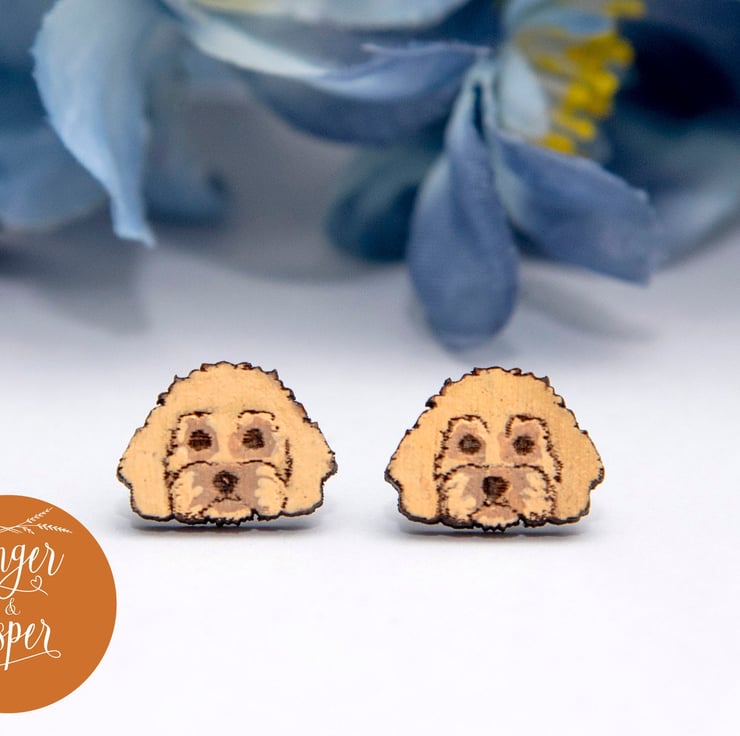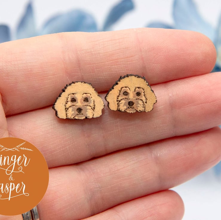 These gorgeous and dainty, wooden Cockapoo dog earrings are laser cut and hand-painted in your choice of colours to match your furry friend! They have stainless steel earring posts and butterfly backs and will be delivered to you on a Ginger & Jasper branded card, as pictured. Size - 14x10mm