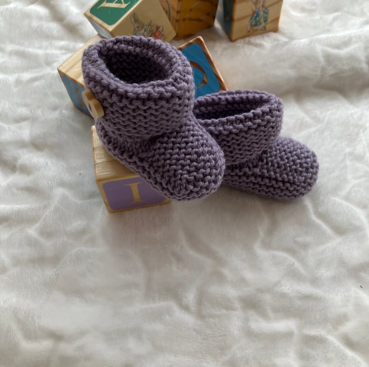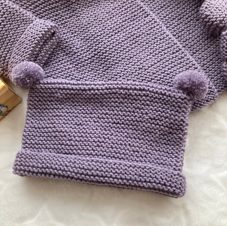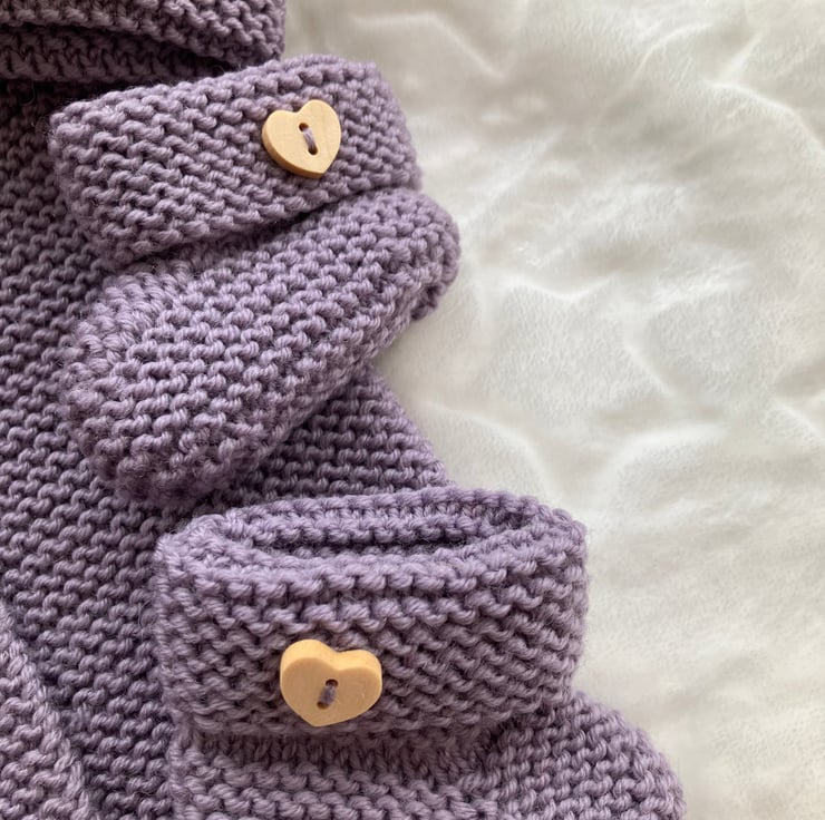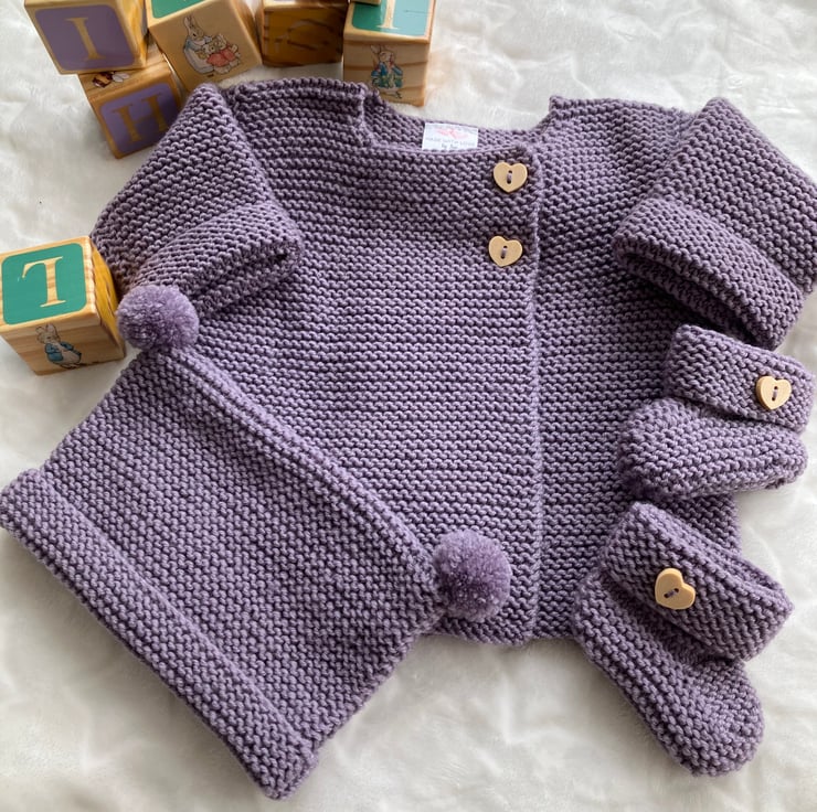 Hand knitted baby girl’s coming home/matinee set. I have knitted this little set in a mauve coloured pure merino wool, which is beautifully soft and warm for your precious little one. The jacket and booties are finished with heart-shaped wooden buttons, and the hat is finished with hand made pom-poms. They have been knitted using garter stitch - a lovely stretchy stitch that allows for greater movement. Would make a great baby shower gift!