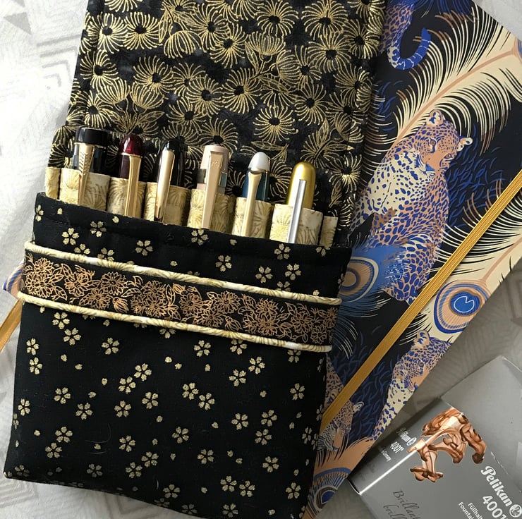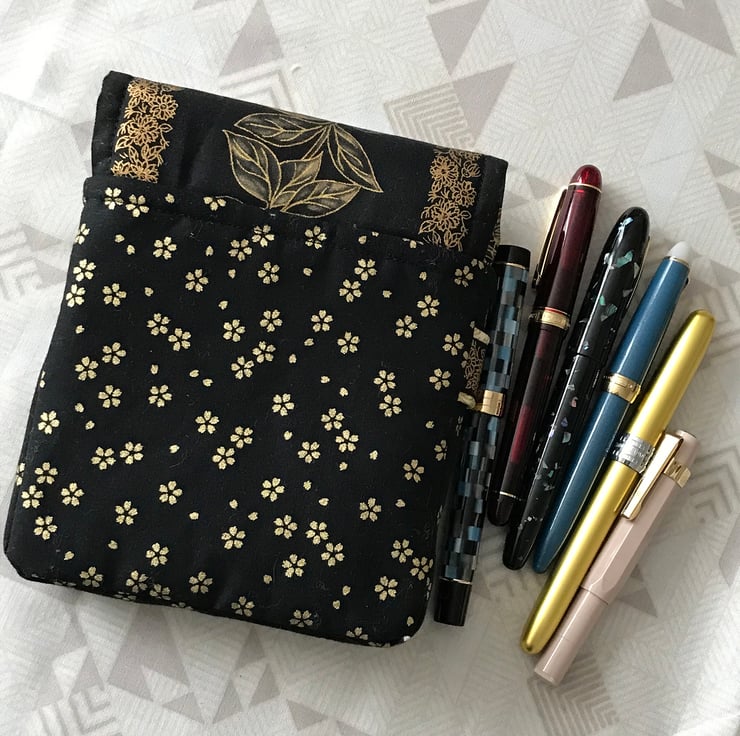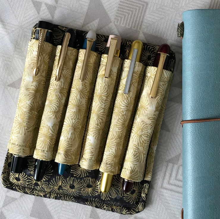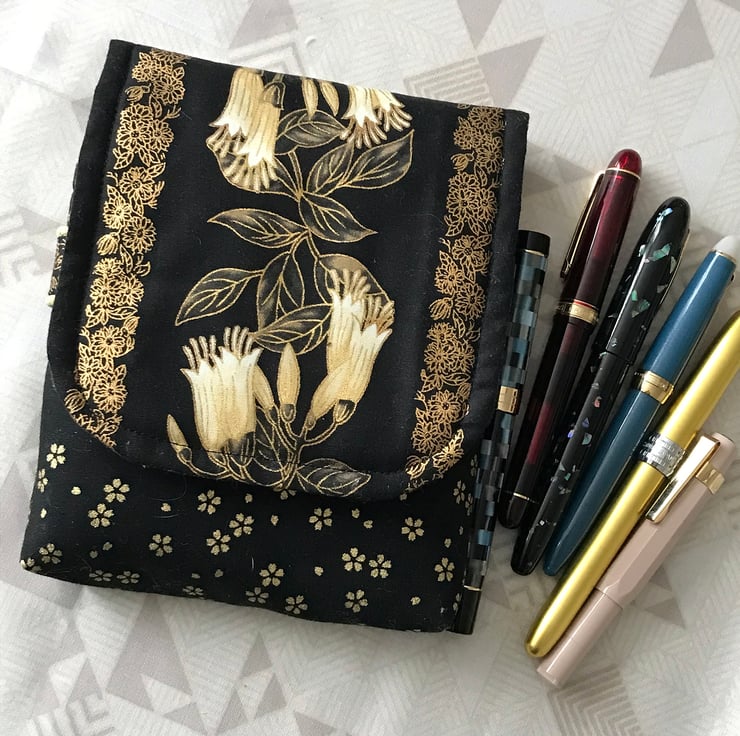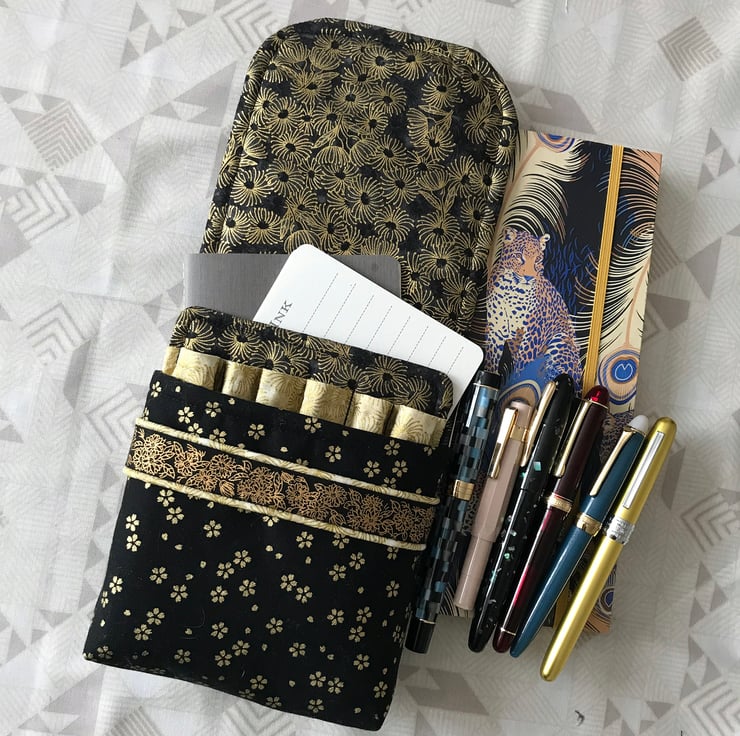 The outer, padded case contains a removable stiffened insert with fabric loops to hold, separate and protect the pens. Each case is made from 25 pieces of fabric. All visible fabrics are 100% cotton. Three types of interlining provide cushioning, support and stability. The pen slots are 10 cm long so give excellent protection and will house all but the chunkiest of pens, while the tuck-under outer flap adjusts to accommodate extra-long pens. There is space behind the insert in which to tuck a note of pens and inks, plus a small slim notebook (such as the Lamy A6 soft cover booklet, available from Cult Pens). Only a very limited number of each case will be made.