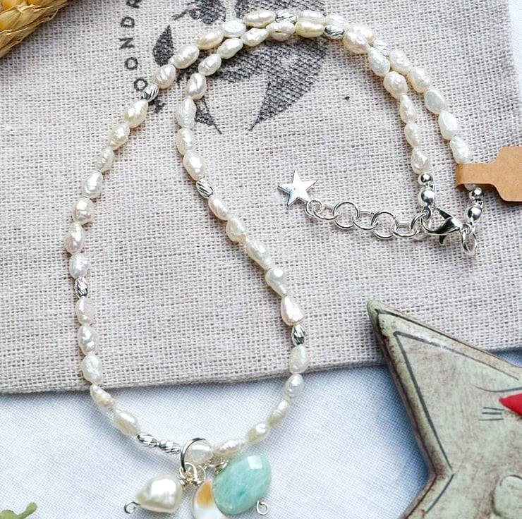 Welcome to our listing for this our lovely handmade necklace, featuring dreamy baroque "rice crispy" style freshwater pearls, faceted healing Amazonite gemstone, and a charming hand-carved mother of pearl crescent moon pendant.