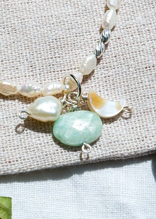 Amazonite is known for its mystical powers to improve communication, spread harmony, and attract good luck – a perfect combo for those seeking balance and fortune! We've finished the pendant set with a large baroque ivory pearl alongside the mother of pearl crescent moon.
