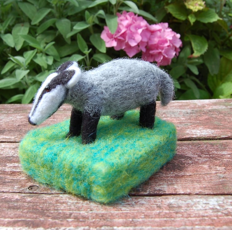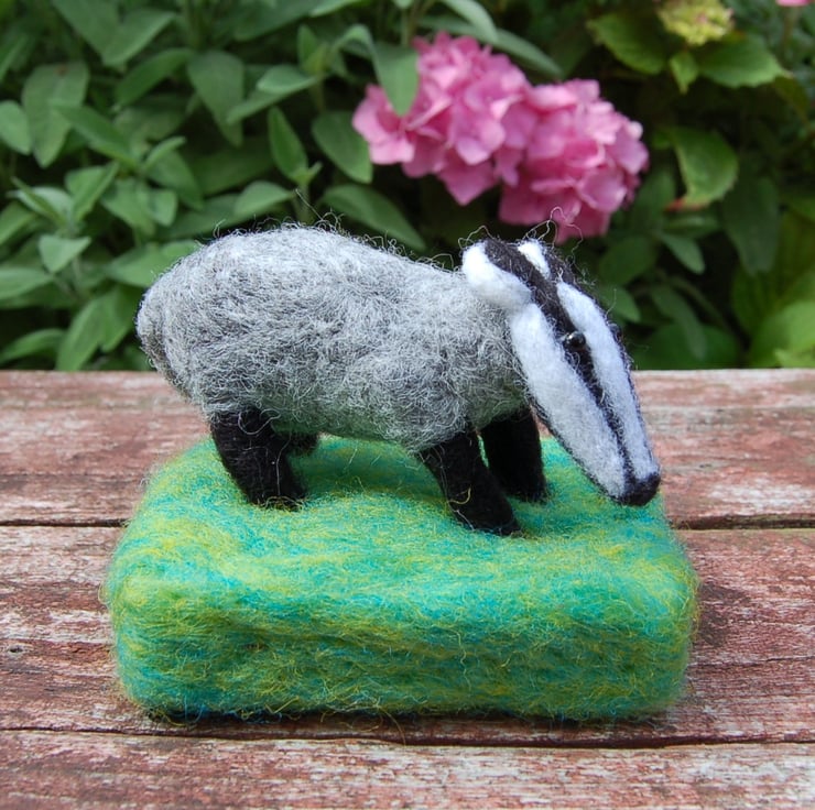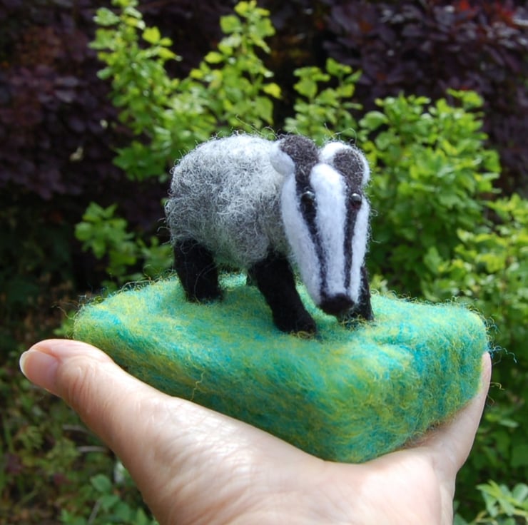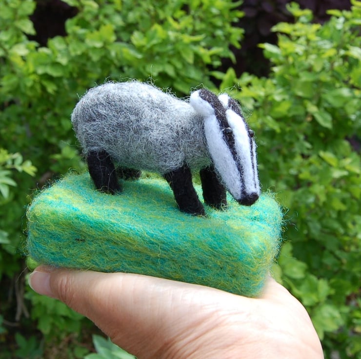 Badger measures 12 cms long and the wool covered base 10 x 9 cms