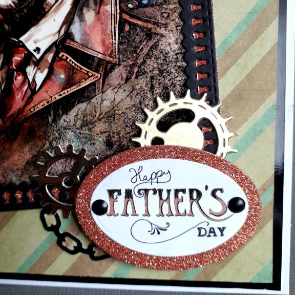 Under the topper I have layered green striped paper onto glossy black card and a white base card, I have added various die cut cogs and chains to embellish and a "Happy Father's Day" sentiment to the bottom right corner.